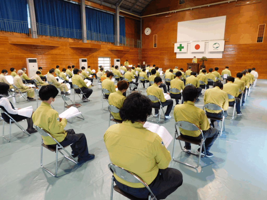 令和4年5月28日(土)、社員74名で経営発表会を開催いたしました。昨年に引き続き新型コロナウイルス対策として間隔をあけて、時間を短縮したうえで行いました。まず初めに、社員全員で「基本理念・社訓・行動指針・安全綱領唱和」を行い、品質管理責任者が「品質・環境・労働安全衛生・コンプライアンス各方針」を代読いたしました。