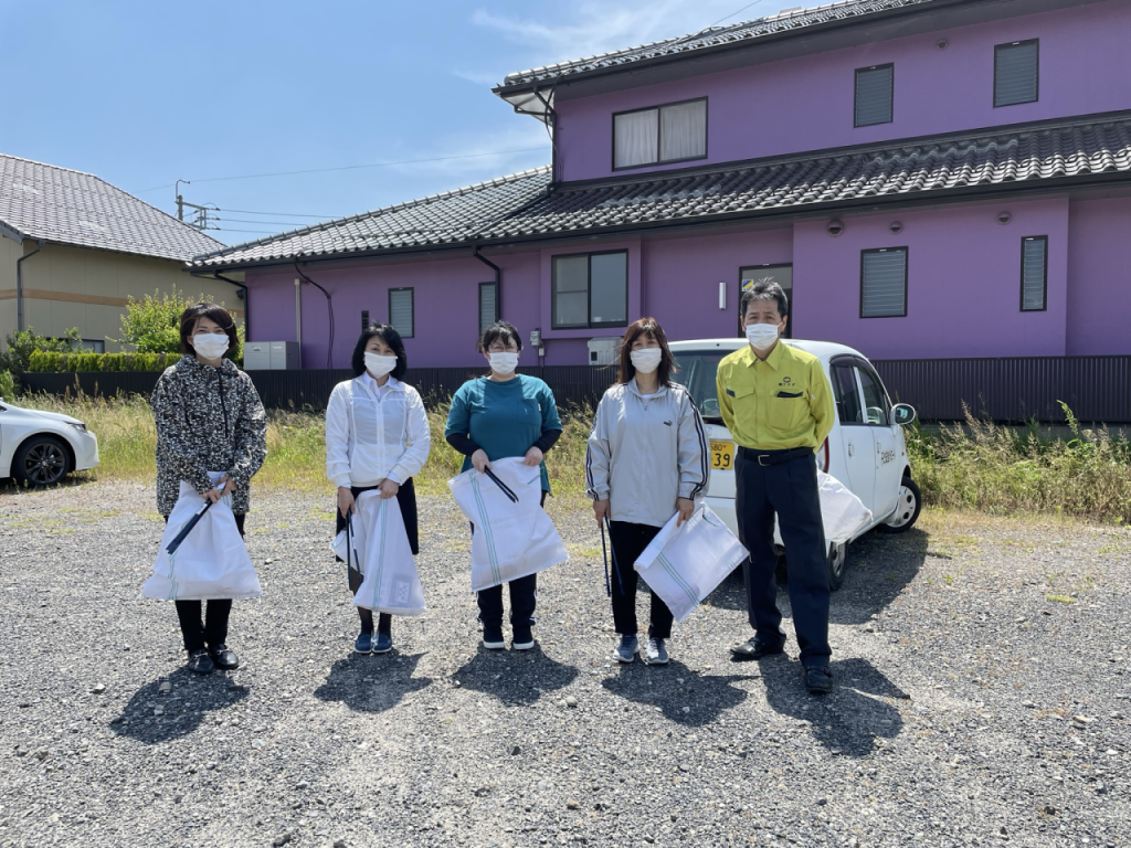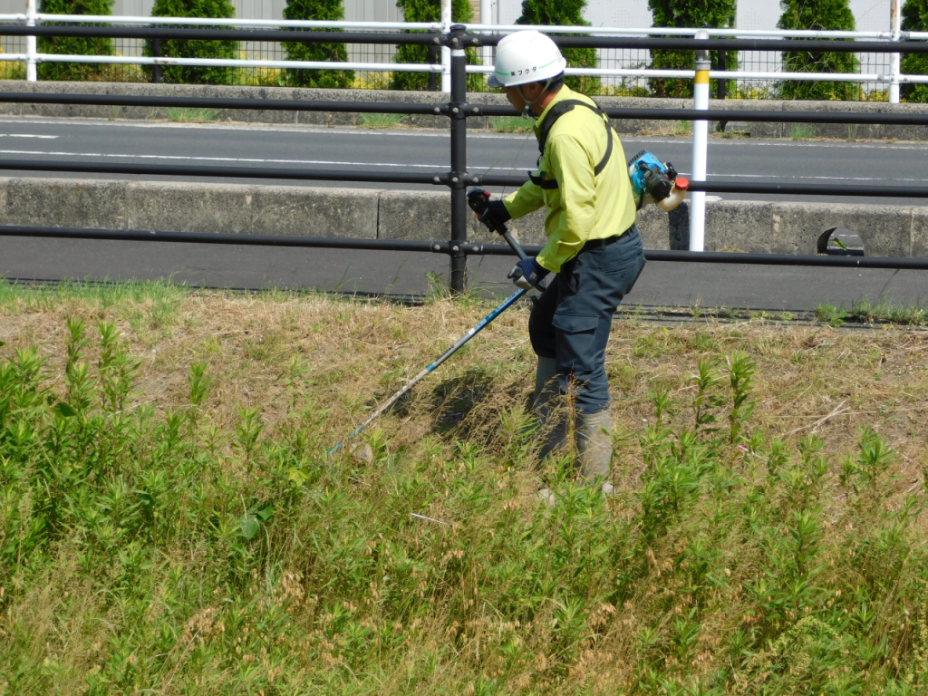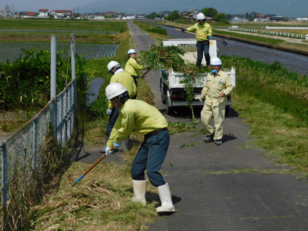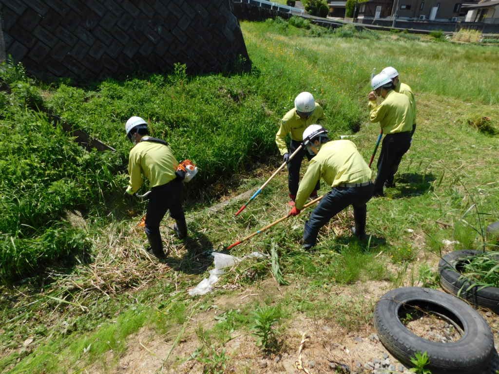 「河川愛護ボランティア」の活動として、高瀬川(島根県一級河川・農業用排水路)河川敷のゴミ拾い等の清掃活動を行いました。「道路愛護ボランティア」の活動として、県道243号(出雲空港線)の歩道や路肩の草刈りを行いました。