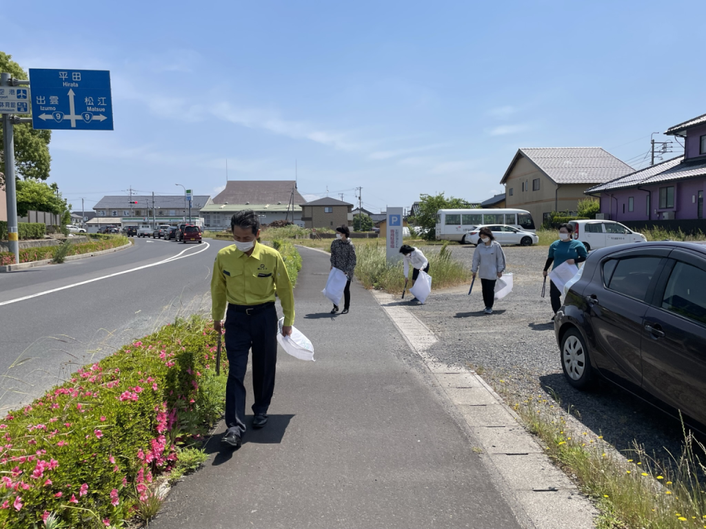 また、「出雲市美化サポートクラブ」の一環として市道新川中央線(国道9号~美幸町交差点)の路肩ゴミ拾いを行いました