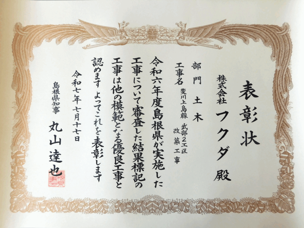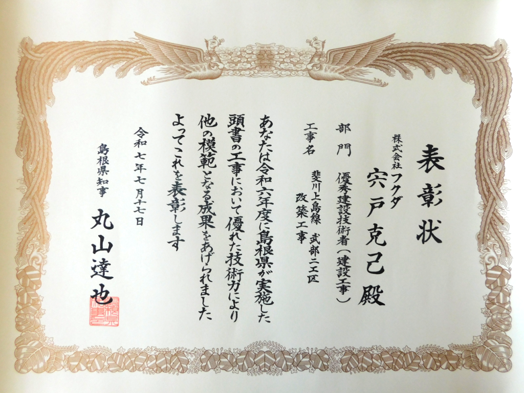 令和7年7月17日、弊社が施工しました「斐川上島線 武部2工区 改築工事」について、優良工事表彰並びに優秀建設技術者表彰をいただきました。