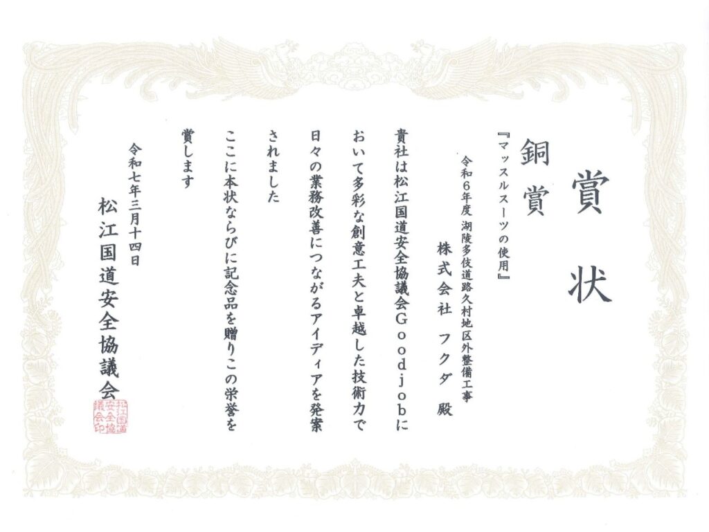 令和7年3月14日、弊社が施工した「令和6年度湖陵多伎道路久村地区外整備工事」において、松江国道安全協議会様から表彰状「銅賞」と記念品を頂きました。