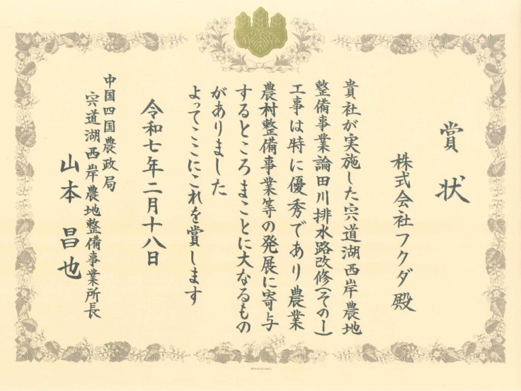 令和7年2月18日、弊社が施工した「宍道湖西岸農地整備事業論田川排水路改修(その1)工事」において、中国四国農政局 宍道湖西岸農地整備事業所長 山本 昌也様から表彰状を頂きました。