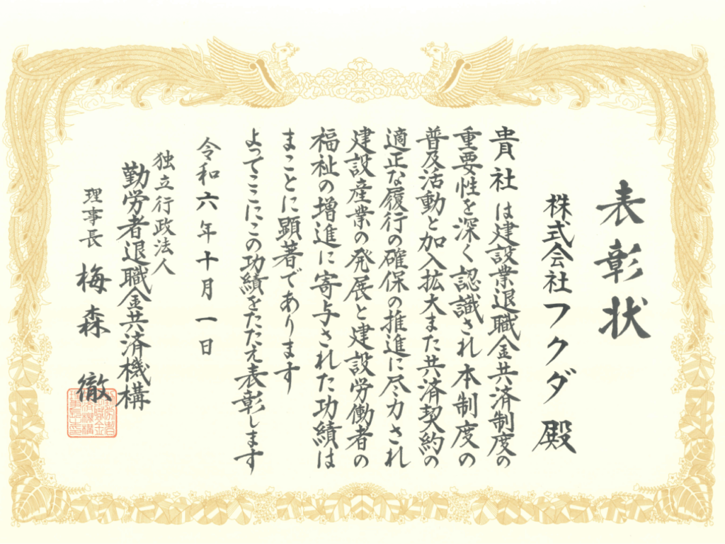 令和6年10月1日、弊社の建設業退職金共済制度が評価され、独立行政法人勤労者退職金共済機構理事長 梅森 徹 様より表彰状をいただきました。