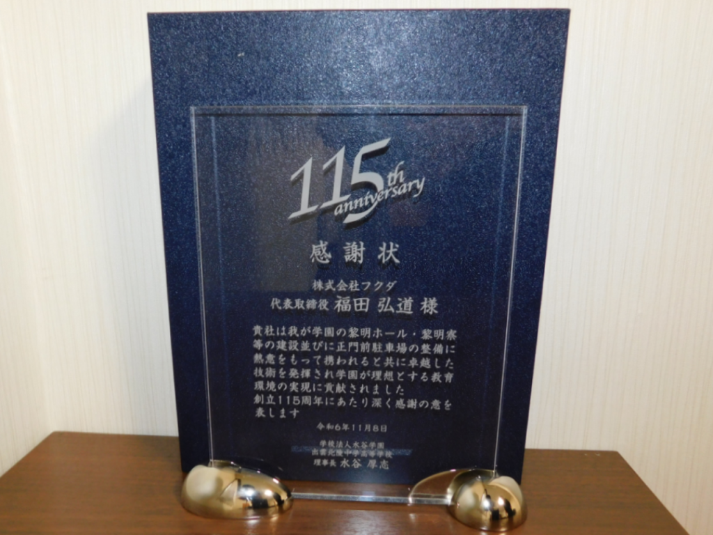 令和6年11月8日、弊社が出雲北陵中学高等学校の建設工事や整備への貢献が評価され、学校法人水谷学園出雲北陵中学高等学校理事長 水谷 厚志様より感謝状をいただきました。