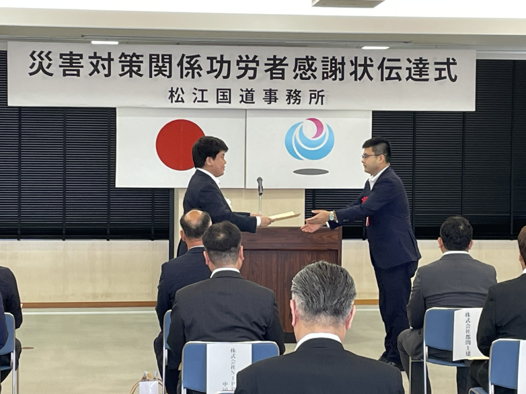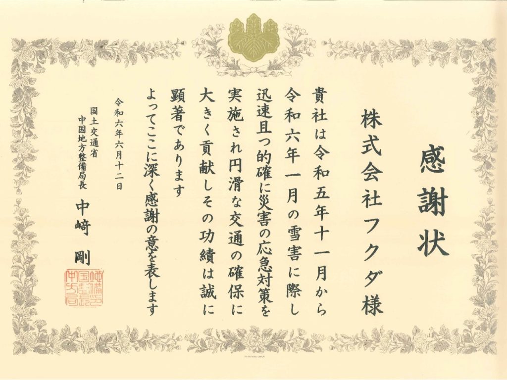 令和6年6月12日、弊社は令和5年11月から令和6年1月に発生した雪害に対して、的確な応急対策を実施し交通確保への貢献が評価され、国土交通省中国地方整備局長 中﨑剛様から感謝状をいただきました。
