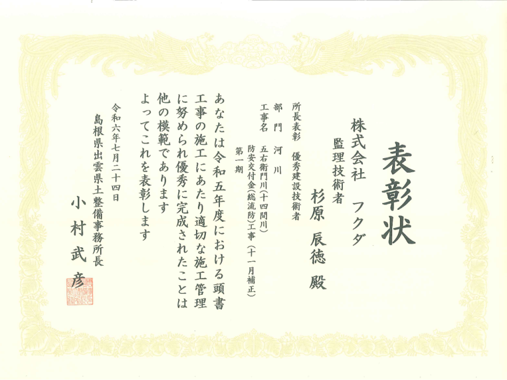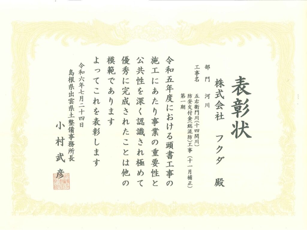 令和6年7月24日、弊社が施工しました「五右衛門川(十四間川)防安交付金(総流防)工事(十一月補正)第1期」について、優良工事表彰並びに優秀建設技術者表彰をいただきました。