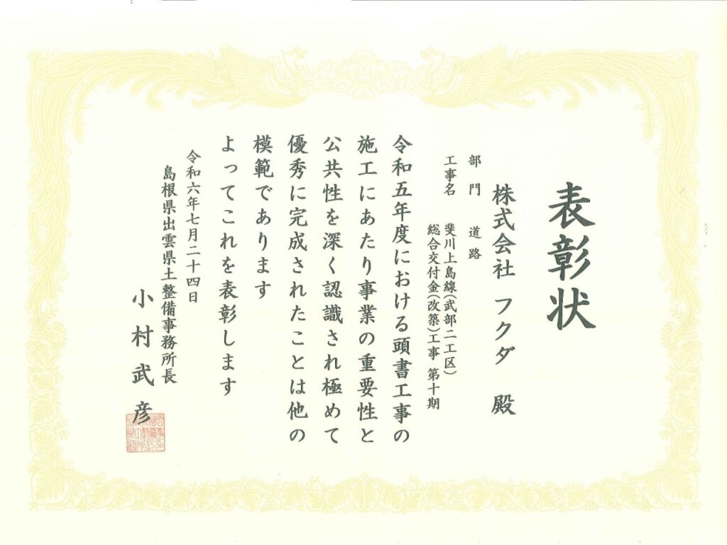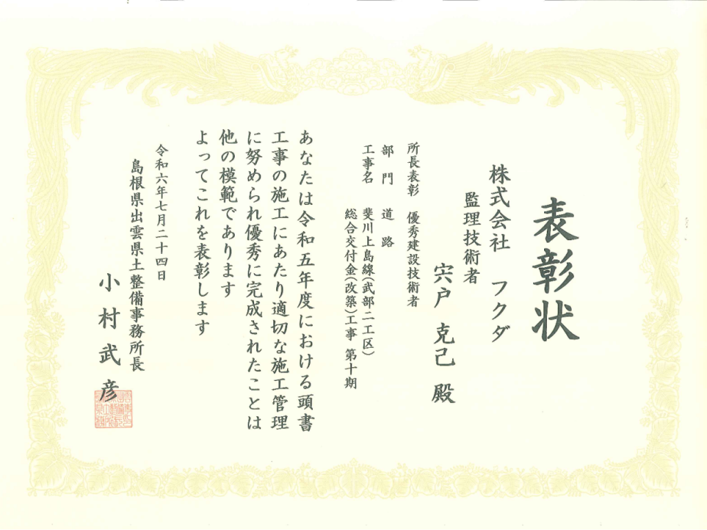 令和6年7月24日、弊社が施工しました「斐川上島線(武部二工区)総合交付金(改築)工事第10期」について、優良工事表彰並びに優秀建設技術者表彰をいただきました。