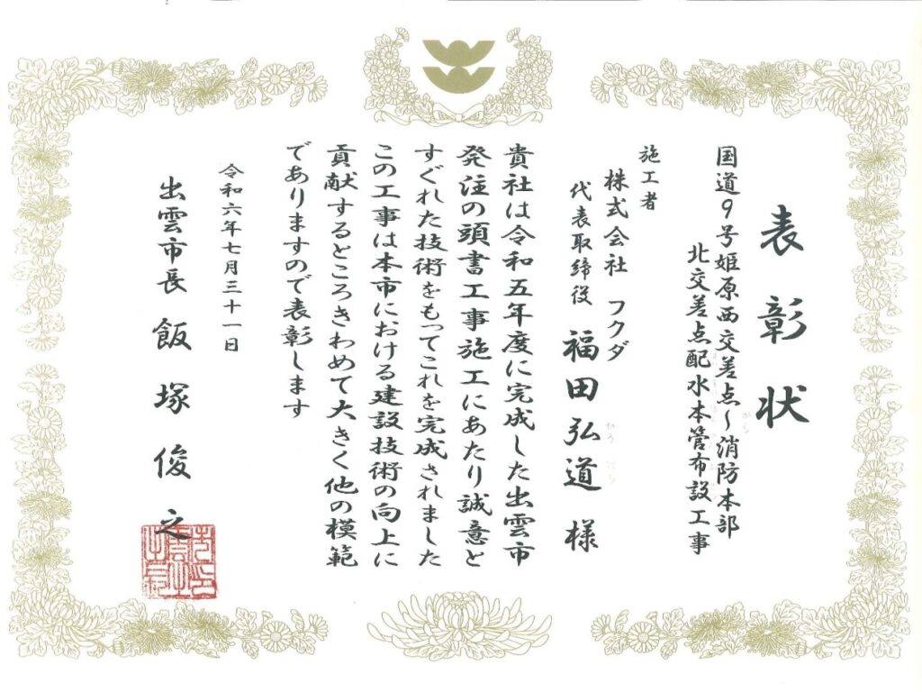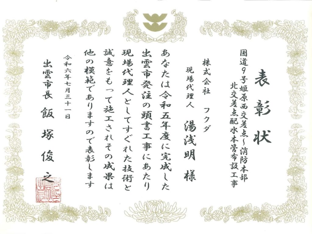 令和6年7月31日、弊社が施工しました「国道9号姫原西交差点~消防本部北交差点配水本管布設工事」が、優良工事表彰並びに優秀建設技術者表彰をいただきました。