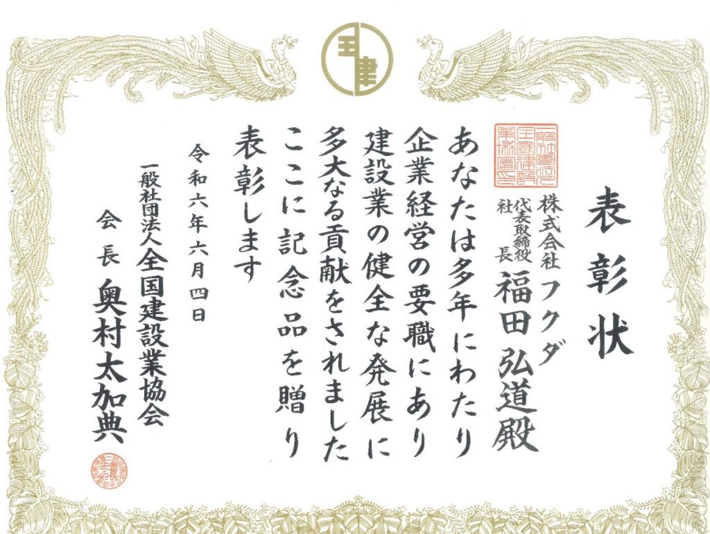 令和6年6月4日、弊社代表取締役社長が企業経営を通じた建設業の発展に貢献したことが評価され、一般社団法人全国建設業協会会長 奥村太加典様より感謝状を頂きました。