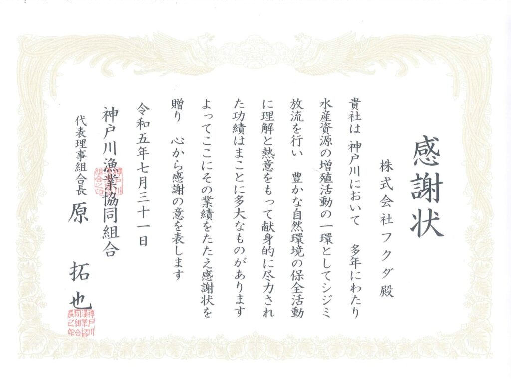 弊社がシジミの放流を通じて自然環境の保全活動に貢献したとのことで、神戸川漁業協同組合代表理事組合長 原拓也様から令和5年7月31日付けで感謝状をいただきました。