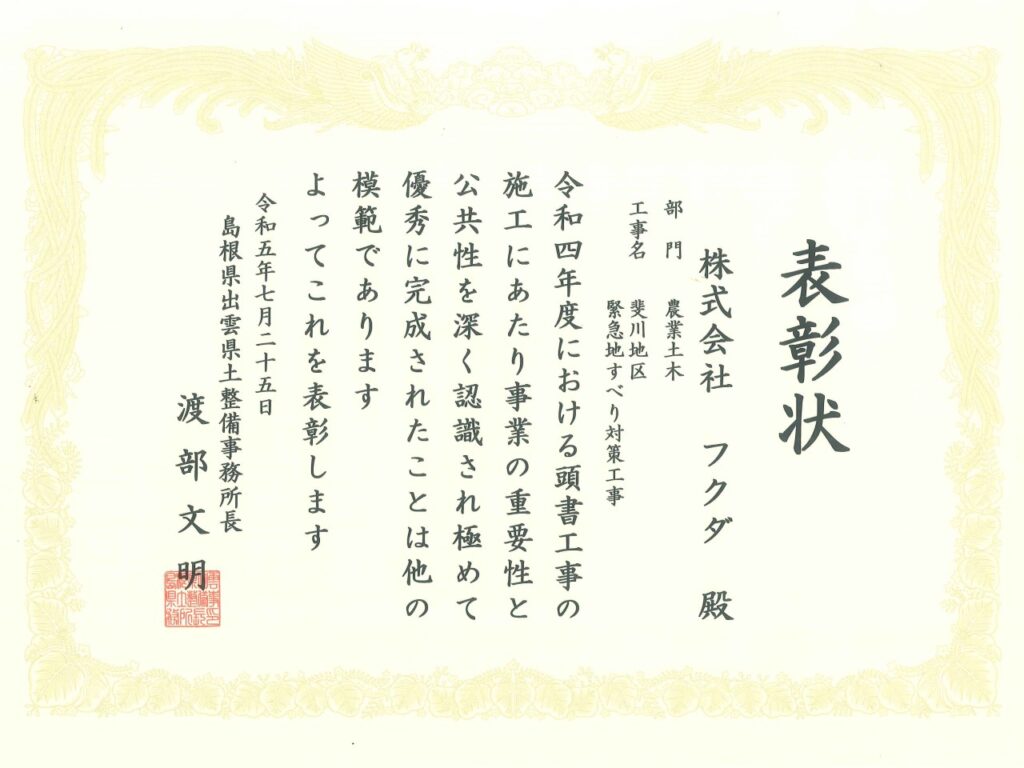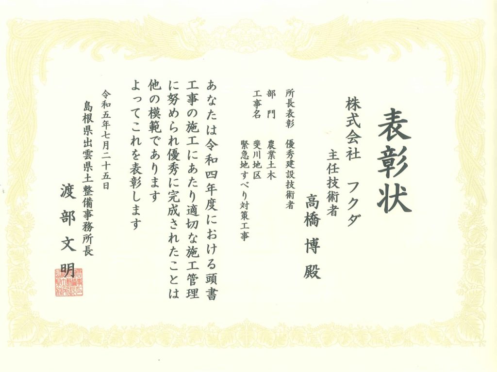 弊社が施工しました「斐川地区 緊急地すべり対策工事」について、優良工事表彰並びに優秀建設技術者表彰をいただきました。
