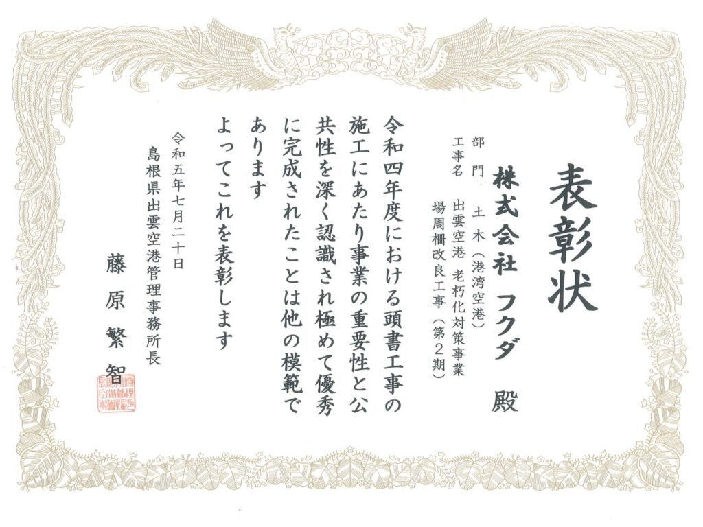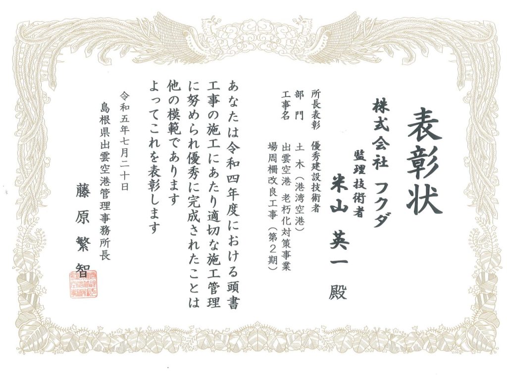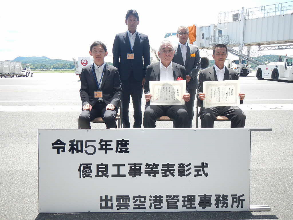 弊社が施工しました「出雲空港老朽化対策事業場周作改良工事(第2期)」について、優良工事表彰並びに優秀建設技術者表彰をいただきました。