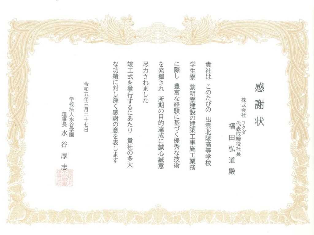 2023年3月27日(月)、弊社が施工させていただいた「出雲北陵高校学校学生寮 黎明寮」が完成し、建設工事における品質・安全管理等への取り組みや技術力が評価され、学校法人水谷学園 理事長 水谷厚志様より感謝状をいただきました。