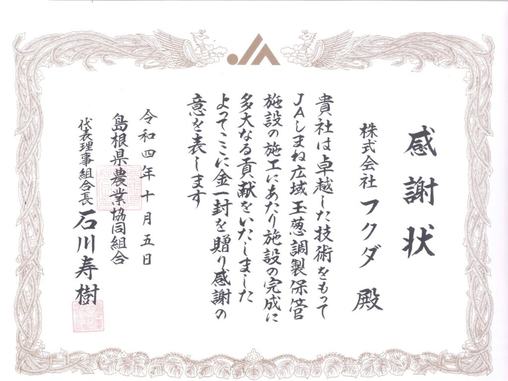 2022年10月5日(水)、弊社が施工させていただいた「JAしまね広域玉葱調整保管施設」建設工事に際して、品質・安全管理への取り組みや技術力が評価され、島根県農業協同組合代表理事組合長 石川寿樹様から感謝状をいただきました。