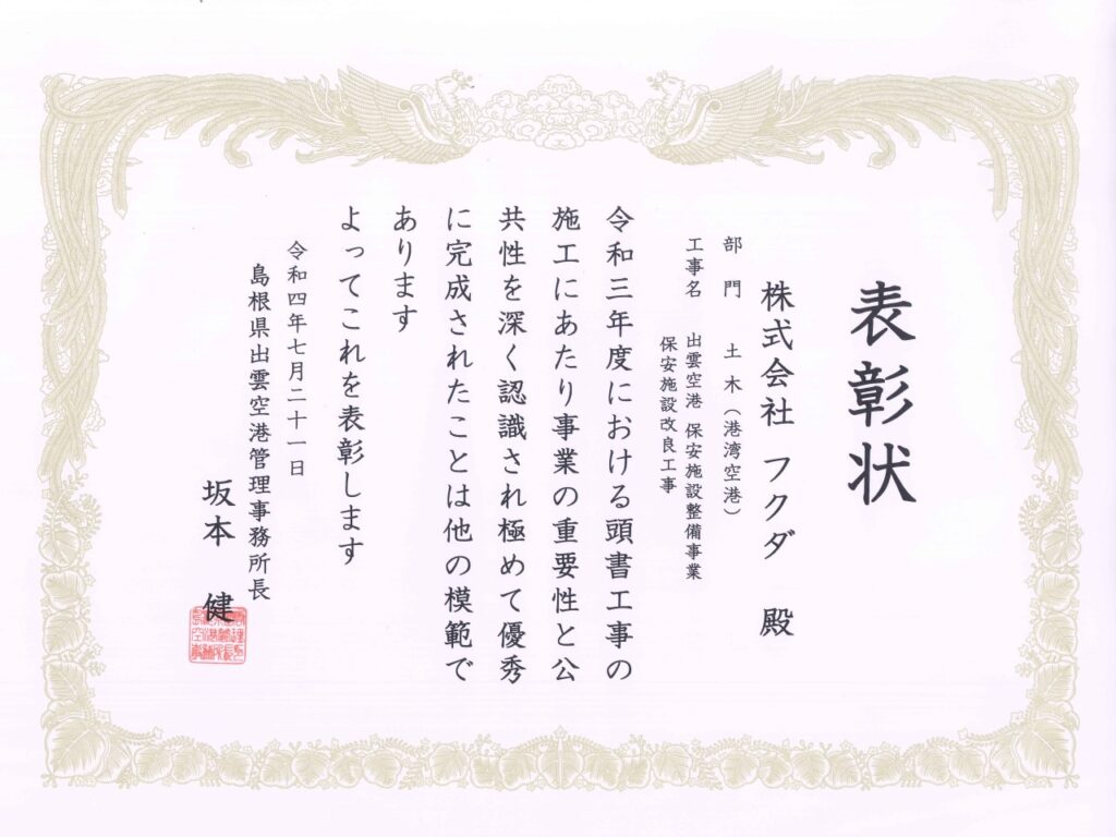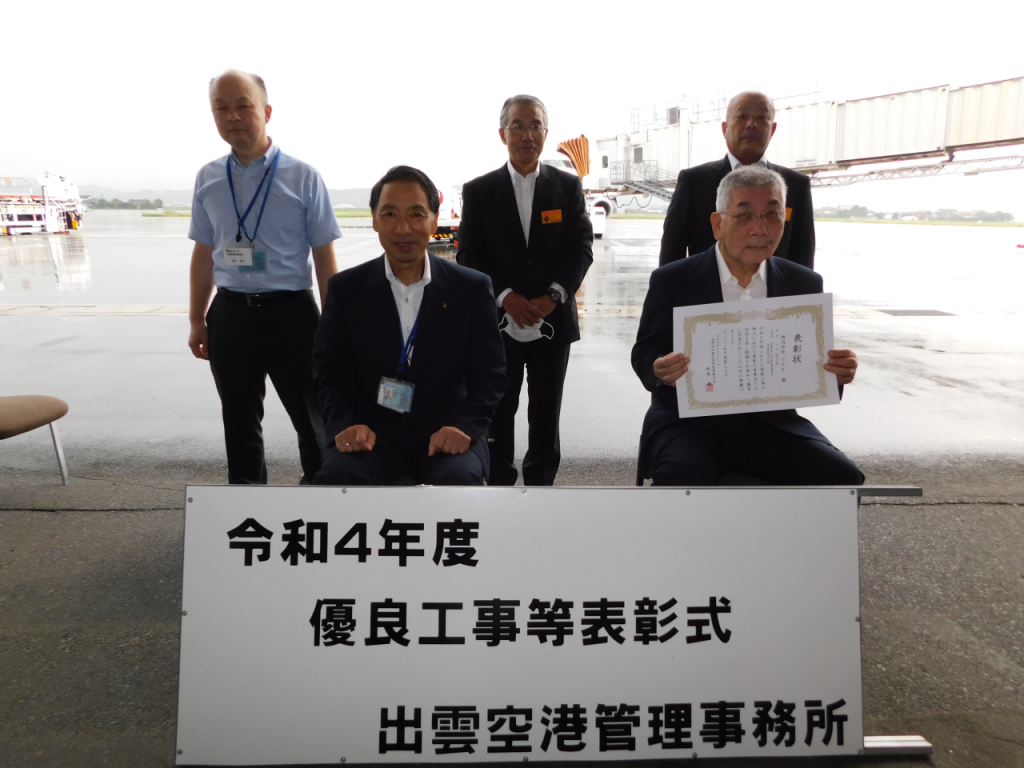 弊社が施工しました「出雲空港 保安施設整備事業 保安施設改良工事」において、優良工事の