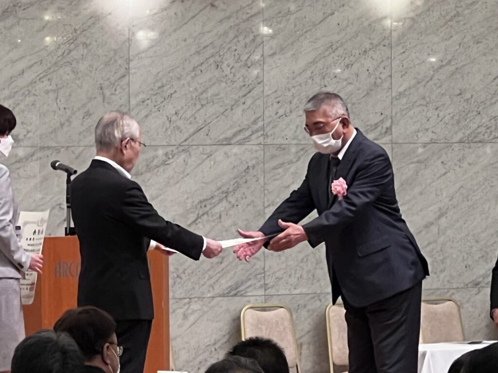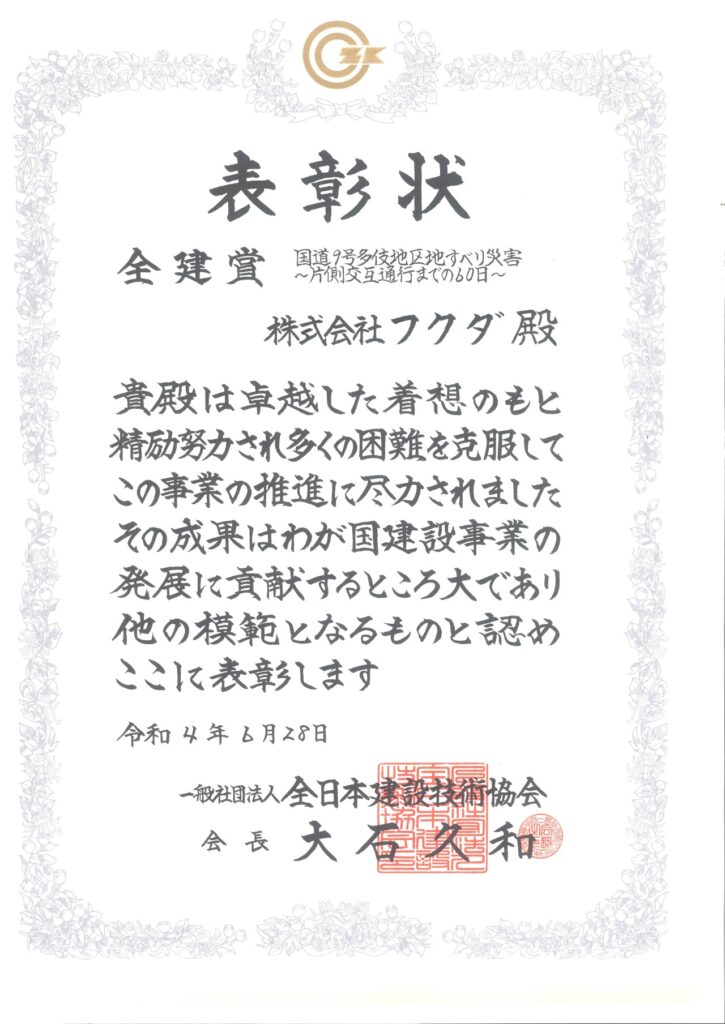 令和3年8月に発生した国道9号多伎地区地すべり災害において、当社が早期復旧に貢献したとのことで、一般社団法人全日本建設技術協会会長 大石久和様から表彰状をいただきました。