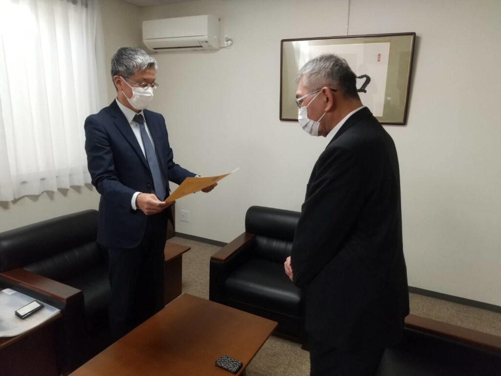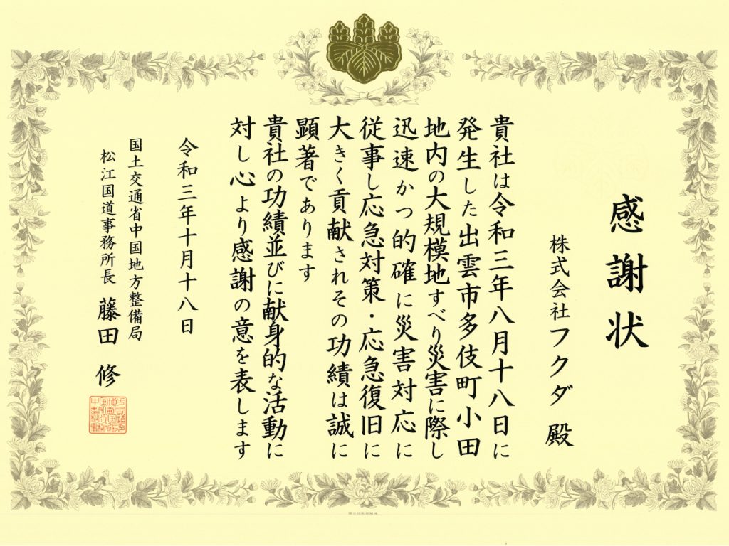 災害発生時、迅速かつ的確に災害対応に従事し応急対策・応急復旧に貢献したとして、国土交通省中国地方整備局 松江国道事務所長 藤田修様より感謝状をいただきました。