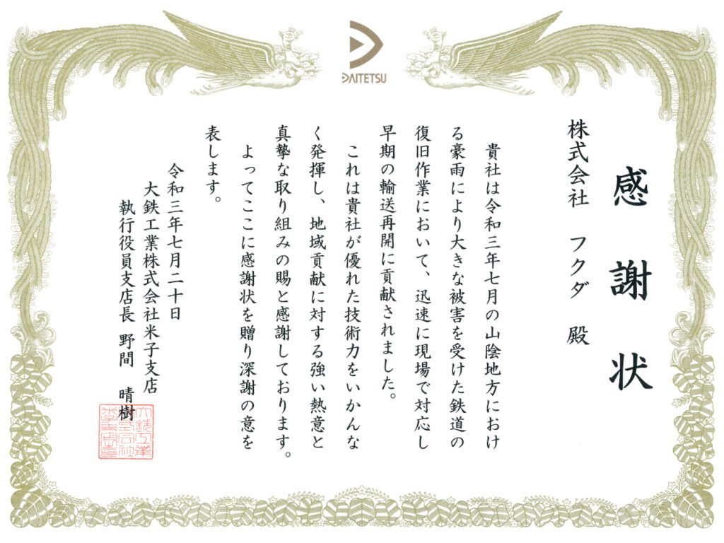 災害発生時、迅速に鉄道の復旧作業を行い早期の輸送再開に貢献したとして、大鉄工業株式会社米子支店 執行役員支店長 野間晴樹 様より感謝状をいただきました。