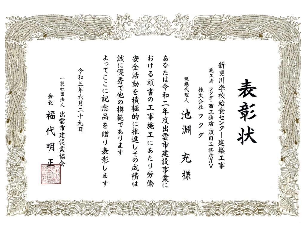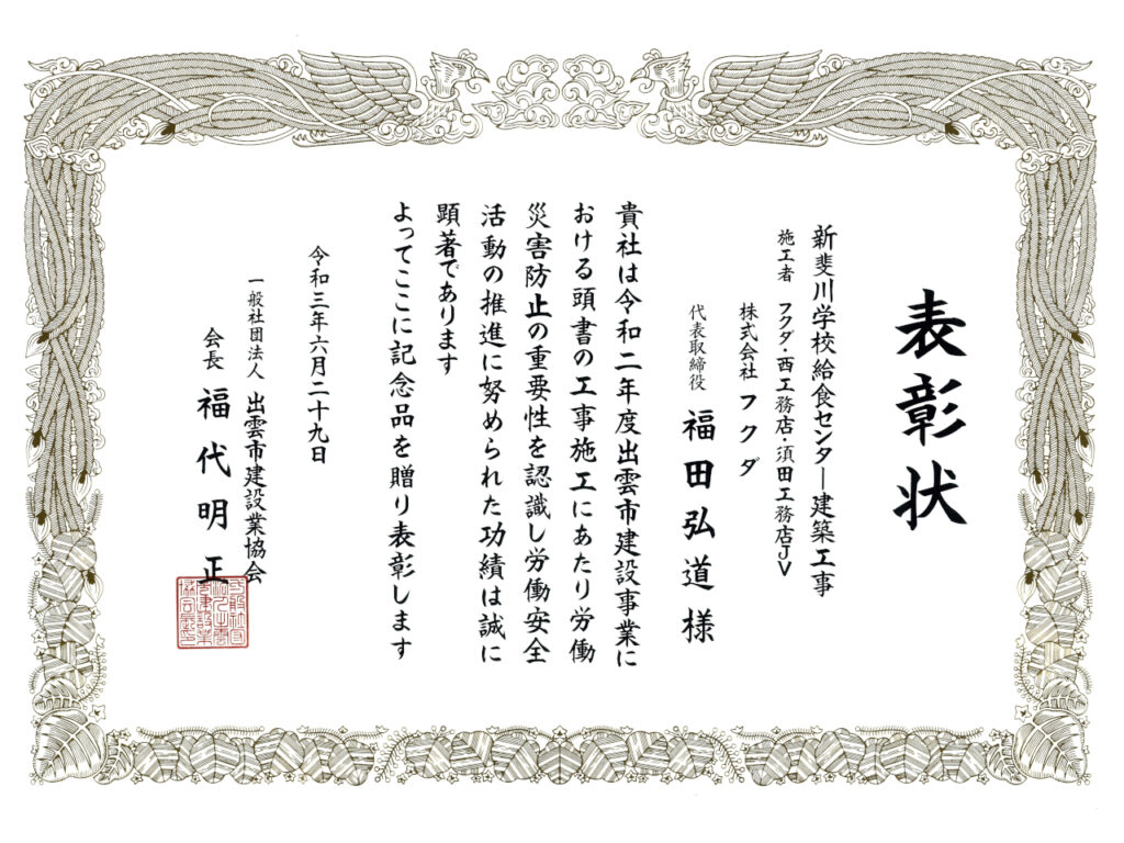 弊社がフクダ・西工務店・須田工務店特定建設工事共同企業体として施工した「新斐川学校給食センター建築工事」において、積極的な安全活動の推進や労働災害防止への取り組みが評価され、一般社団法人出雲市建設業協会会長 福代明正 様より表彰状と記念品を頂きました。