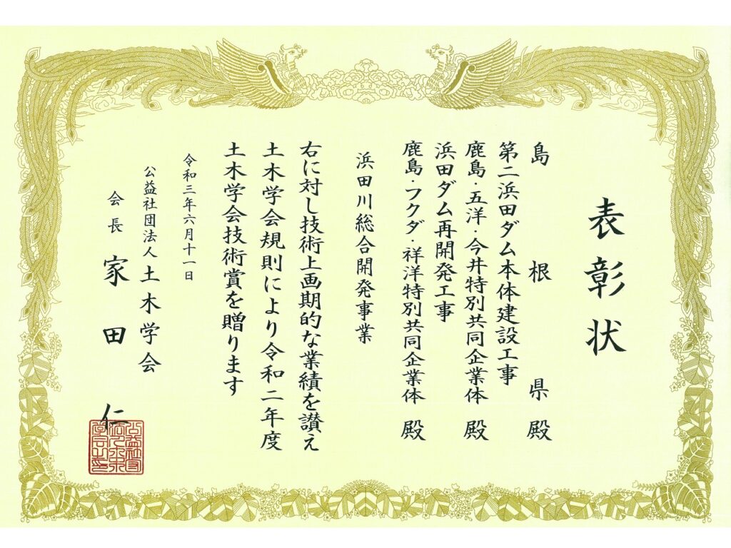 弊社が鹿島・フクダ・祥洋建設特別共同企業体として施工した「浜田ダム再開発工事」において、別途施工された「第二浜田ダム本体建設工事」と併せて、新設と再開発によるハイブリッドダム事業の取り組みが評価され、公益財団法人土木学会会長 家田 仁 様より表彰状を頂きました。