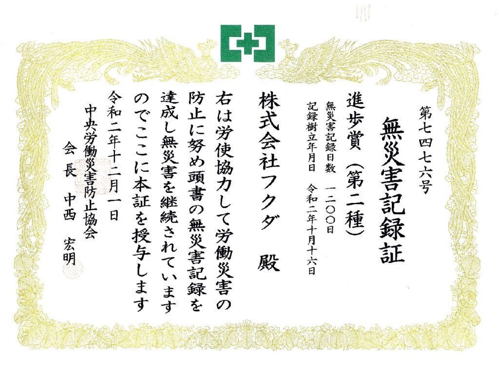 2020年12月1日(火)、弊社は無災害記録日数1,200日を達成し、中央労働災害防止協会 会長 中西宏明様より「無災害記録証 進歩賞(第二種)」を頂きました。