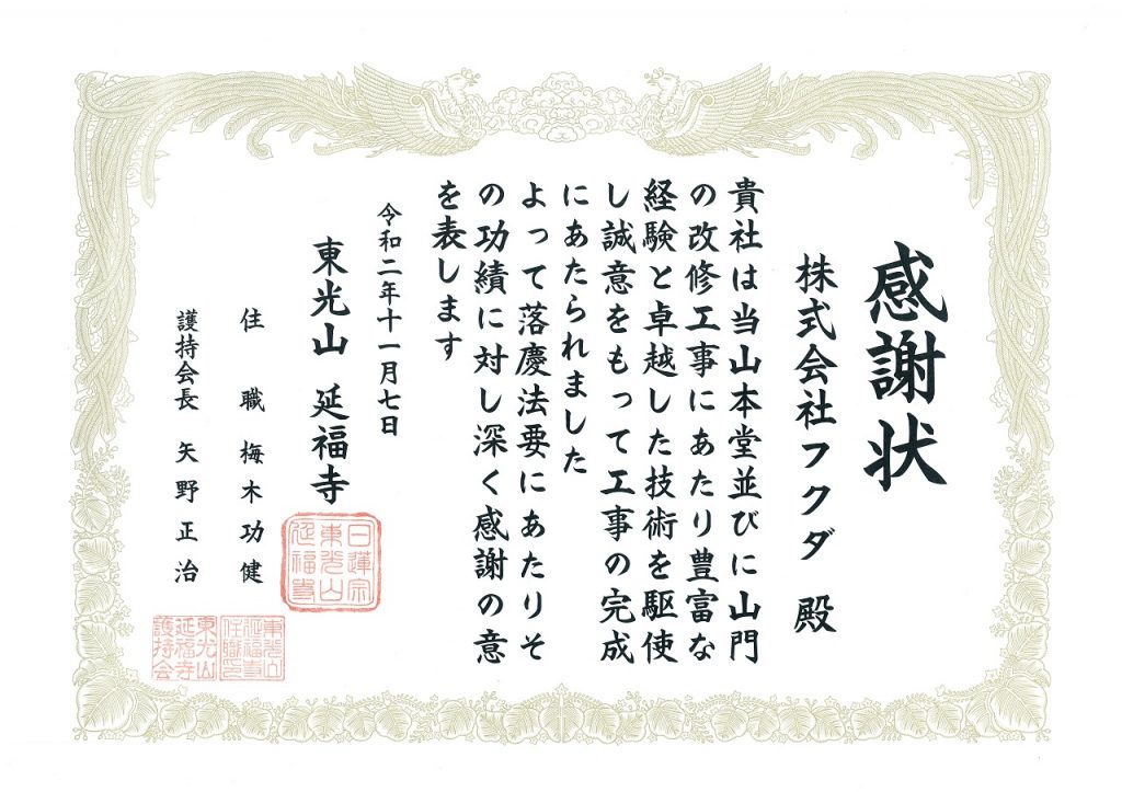 法要の中で感謝状の贈呈式が執り行われ、弊社が施工させていただいていた本堂及び廊下・山門改修工事について、安全・品質管理への積極的取り組みが評価され、東光山 延福寺 住職 梅木功健 様、護持会長 矢野正治 様より感謝状をいただきました。