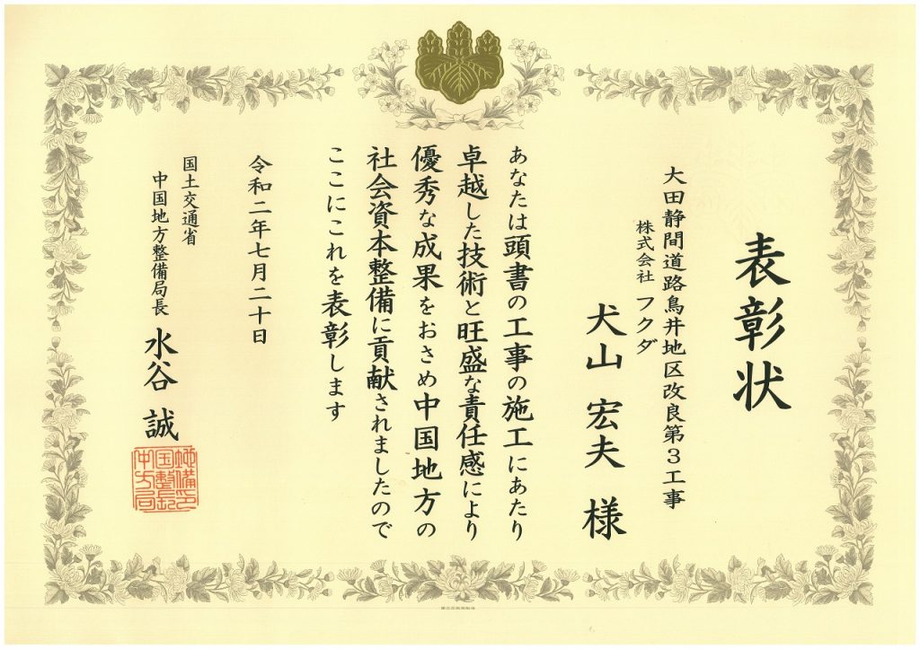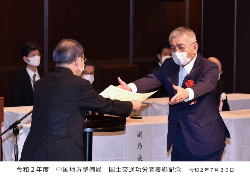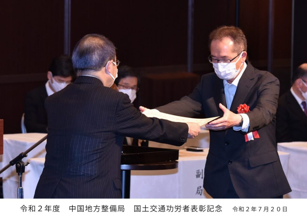 令和2年7月20日、国土交通省中国地方整備局にて国土交通功労者表彰式が執り行われました。