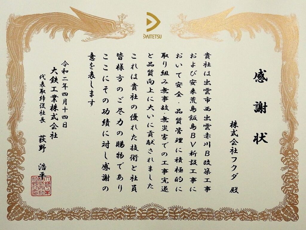 弊社が施工させていただいている「出雲市西出雲赤川B改築工事」および「安来荒島飯島BV新設工事」において、安全・品質管理への積極的な取り組みが評価され、大鉄工業株式会社 代表取締役社長 荻野浩平 様より感謝状をいただきました。
