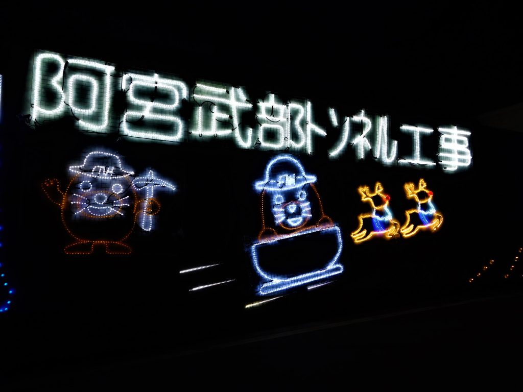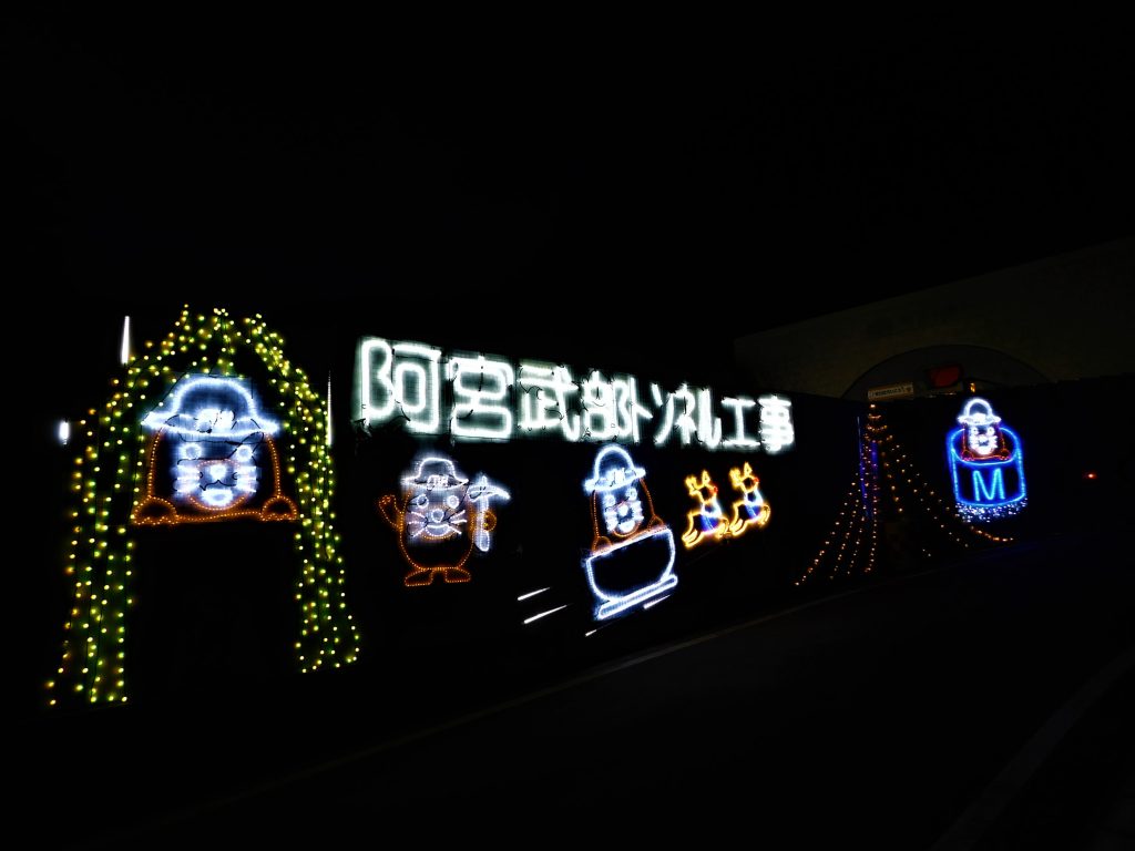 阿宮武部トンネル工事現場の仮囲いにイルミネーションを設置しました。12月に入り寒くなってまいりましたが、当現場のマスコットキャラクターである「もぐくん」も冬仕様にいたしました。イルミネーションは夕方5時から翌早朝までライトアップしております。2月末頃まで設置しておりますので近くを通られた際は是非ご覧になってください。