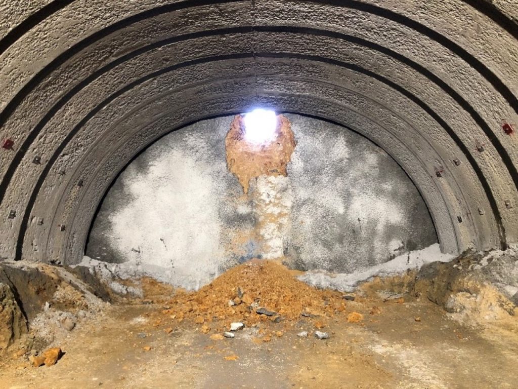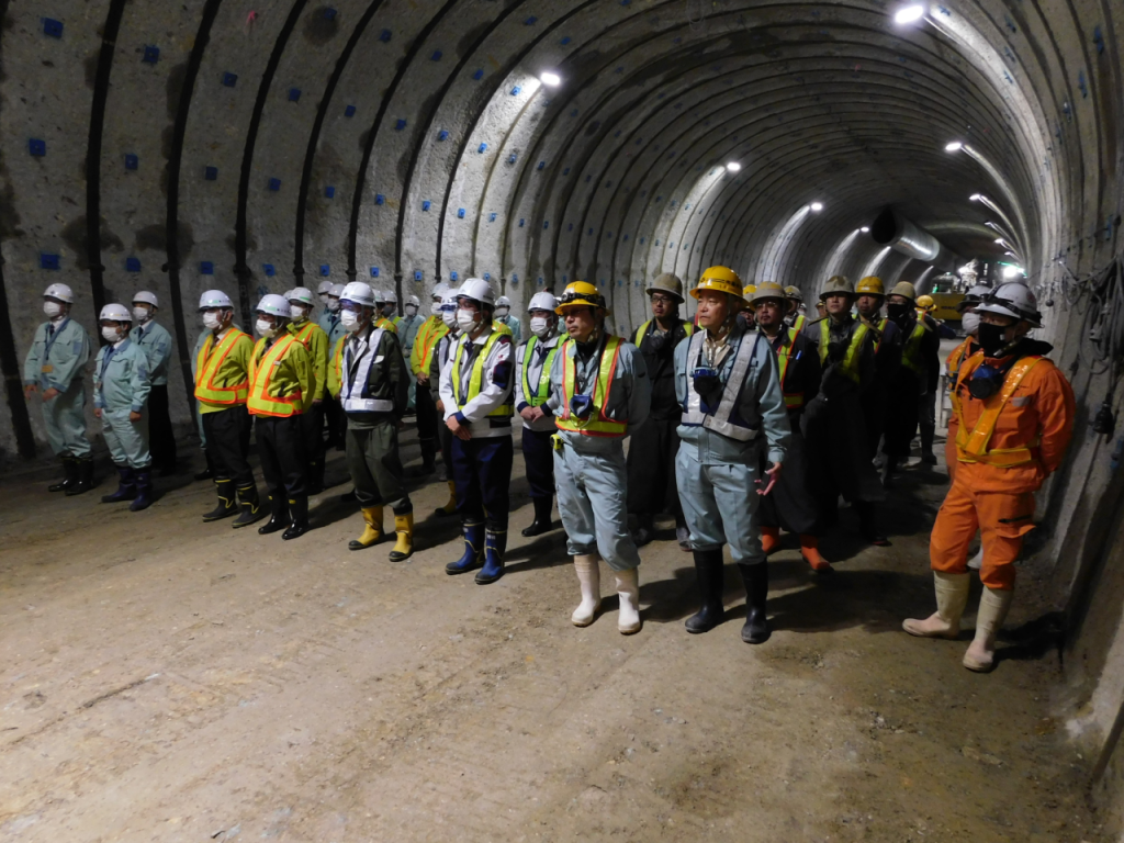 昨年の9月からトンネル掘削に着手し、1年2カ月を経て貫通となりました。途中突発出水に遭遇し、約2カ月間掘削がストップすることもありました。また、当初設計より地質が脆く補強工事を追加でおこなうなど苦労が絶えませんでしたが、本日無事に貫通させることができました。