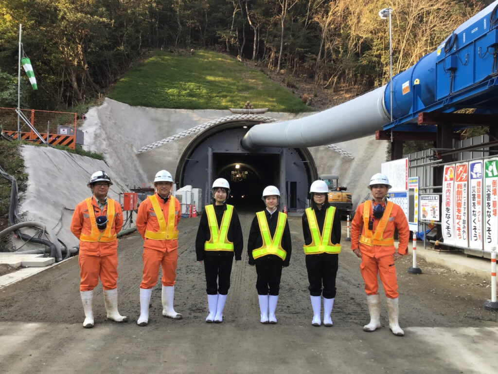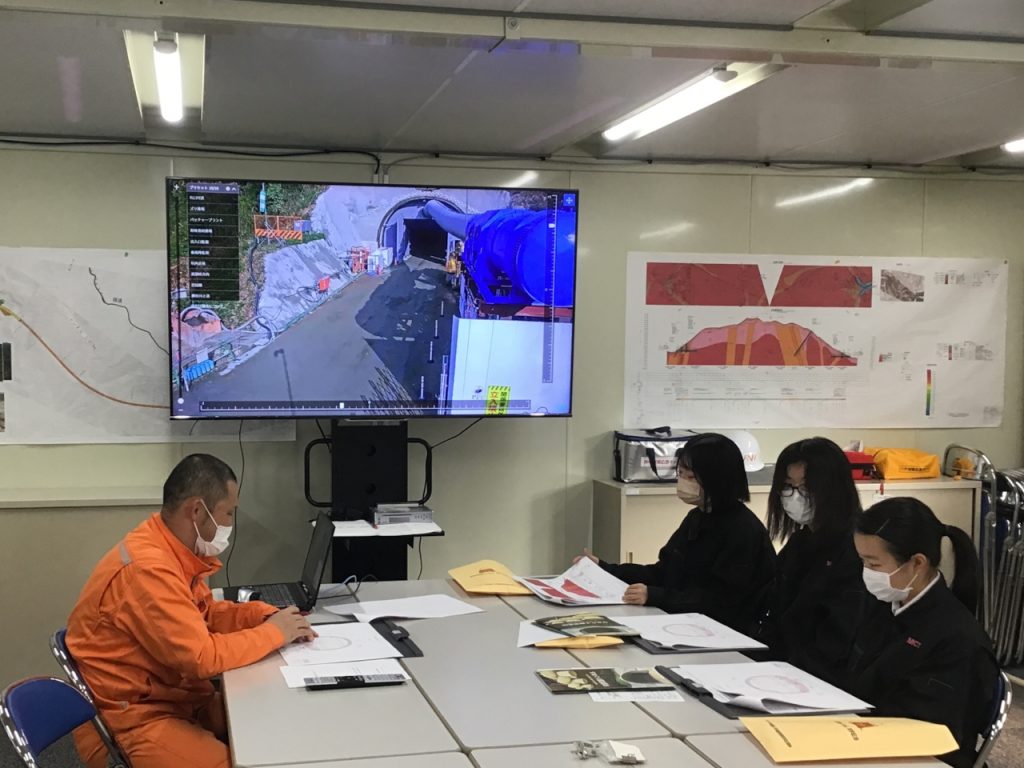 令和3年11月2日(火)、弊社がフクダ・中筋組・平井建設特別共同企業体として施工中の「(一)斐川上島線(武部2工区)総合交付金(改築)(仮称)武部トンネル工事」にて、松江工業高等専門学校の学生3名をお招きして現場体験学習会を開催しました。