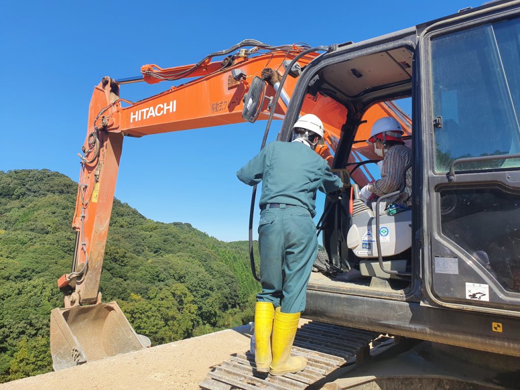 現場責任者から工事概要の説明を行い、専用のソフトと3次元測量点群データを使った土量計算などを行う様子をご覧いただいたり、最新のICT機器を搭載した様々な重機に試乗していただきました。