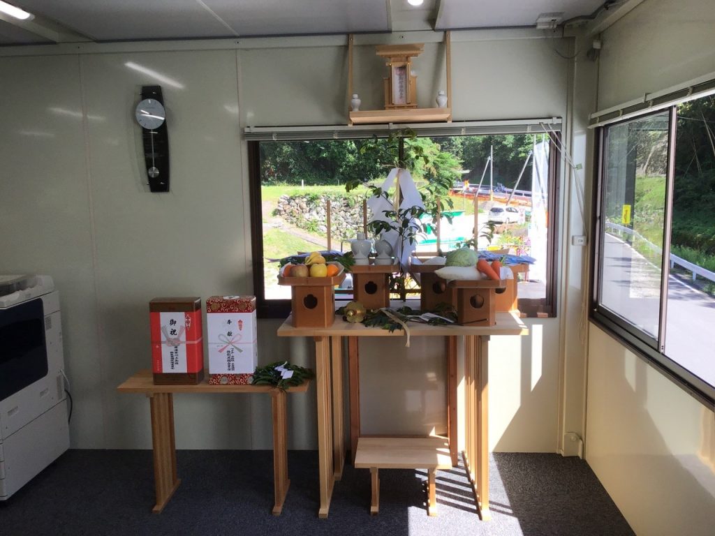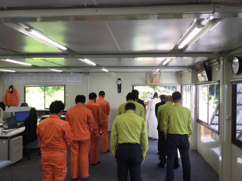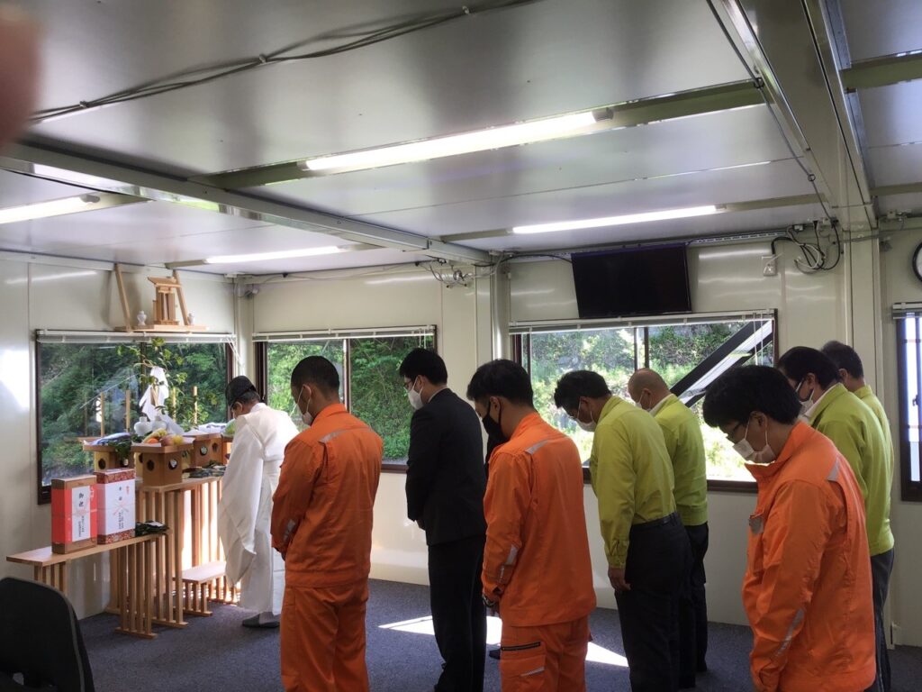 令和3年5月28日(金)に、(-)斐川上島線(武部2工区)総合交付金(改築)(仮称)武部トンネル工事の安全祈願祭(事務所開き)を執り行いました。神事は阿吾神社宮司花田様に執り行っていただきました。一般県道斐川上島線・武部2工区バイパスの要である延長879mのトンネルを無事に完成する為に、令和5年5月工期末まで『安全第一』で進めてまいります。