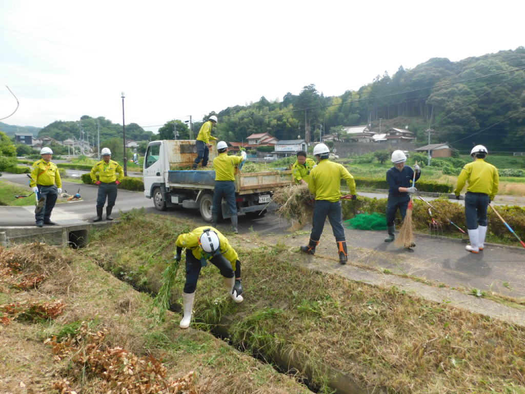 斐川町内には26ヶ所の揚水機場があり、大部分は地元で設置されている各用水協議会で管理されています。その維持管理について土地改良区と話し合いをした結果、当社ボランティア活動の一環として、黒目新田揚水機場の草刈りを行うこととしたものです。