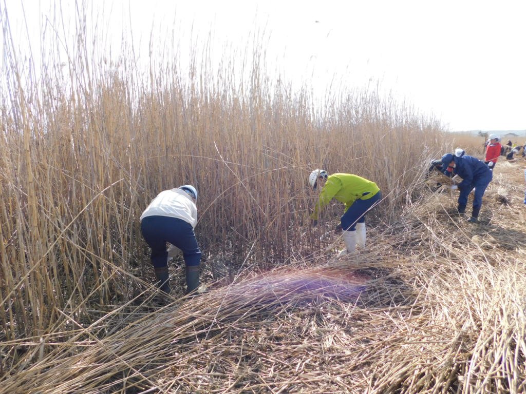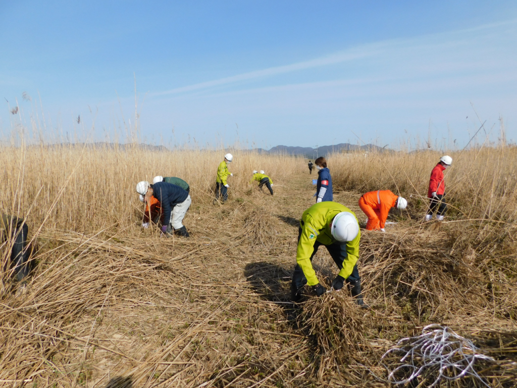 宍道湖水環境改善協議会は、ヨシ帯の健全な保全と育成を目的として冬季にヨシを刈り取る活動を行っています。ヨシ帯は、さまざまな生き物の生息・繁殖場所であり、水質浄化の役割も果たしていますが、定期的な刈り取りなどの適切な管理が欠かせません。