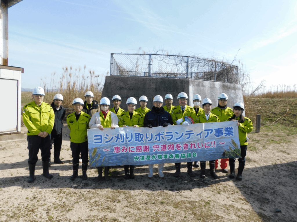 令和7年3月14日(金)、出雲市斐川町坂田にある「宍道湖西岸なぎさ公園」にて、宍道湖水環境改善協議会が主催するヨシ刈り取りボランティア活動が行われ、当社からは15名の社員が参加しました。