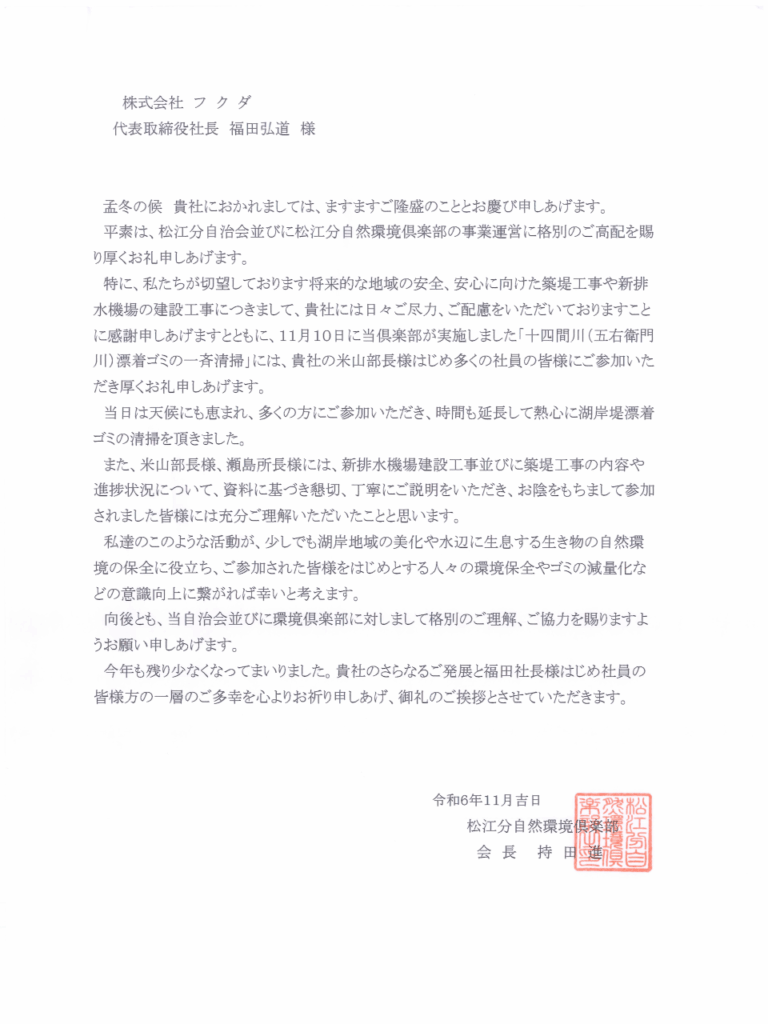 松江分自然環境倶楽部様よりお礼状をいただきました。