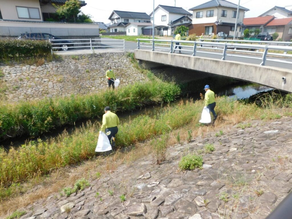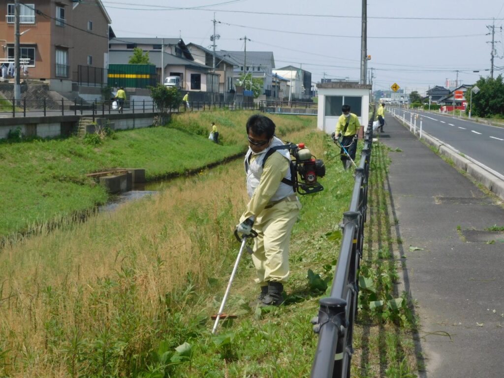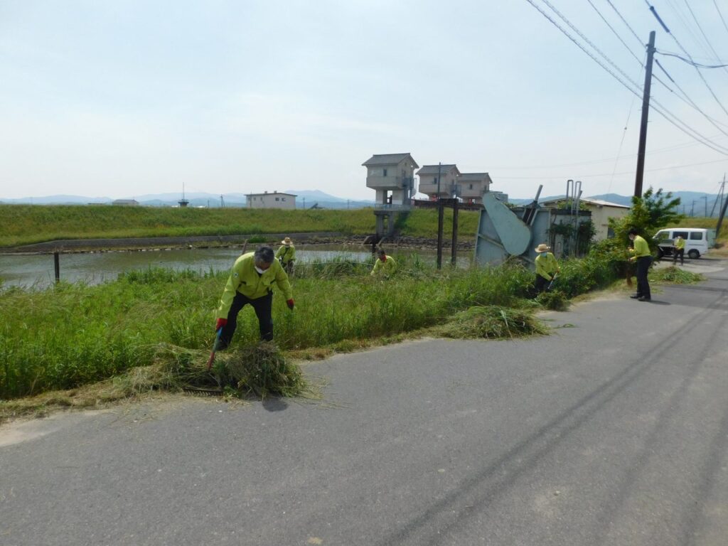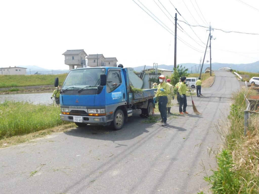 「河川愛護ボランティア」の活動として、高瀬川(島根県一級河川・農業用排水路)河川敷のゴミ拾い等の清掃活動を行いました。「道路愛護ボランティア」の活動として、県道243号(出雲空港線)の歩道や路肩の草刈りを行いました。