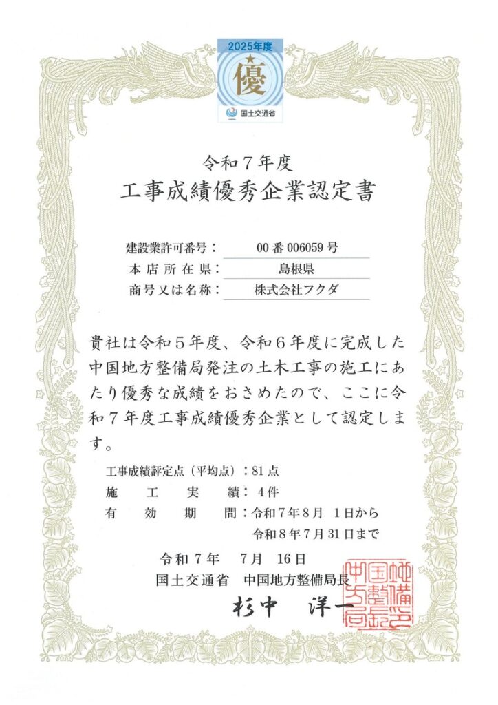 令和7年7月16日、弊社は国土交通省中国地方整備局発注工事で過去2ヶ年度に完成した直轄土木工事の実績を3件以上有し、かつその対象工事の平均点が80点以上を達成したとして、国土交通省中国地方整備局から令和7年度工事成績優秀企業の認定を受けました。