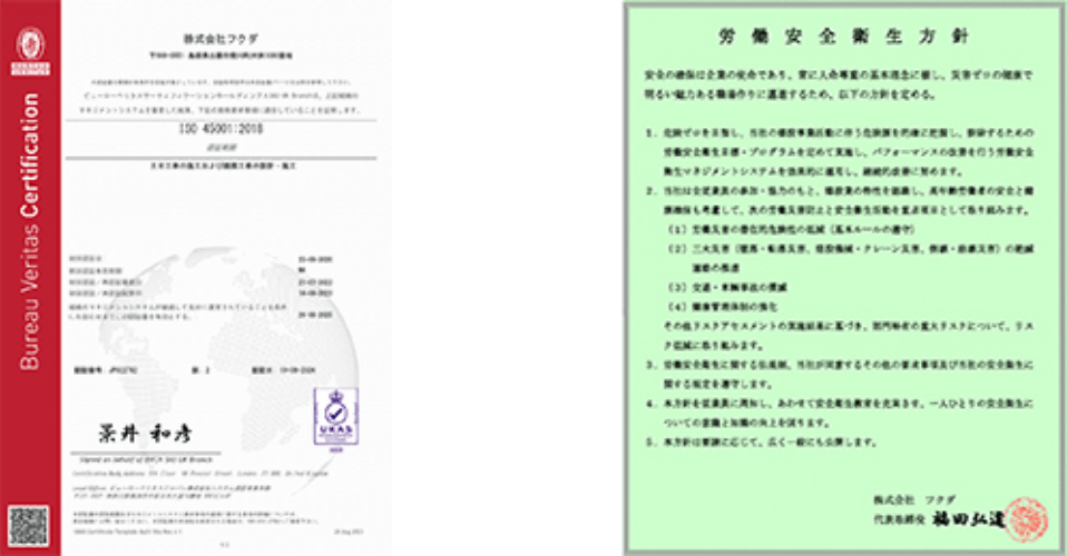 職場における労働安全衛生上のリスクを管理し、危険を防止し安全性を確保することを目的としOHSAS18001を2005年(平成17年)11月に取得し、2020年(令和2年)9⽉にISO45001へ移⾏いたしました。
