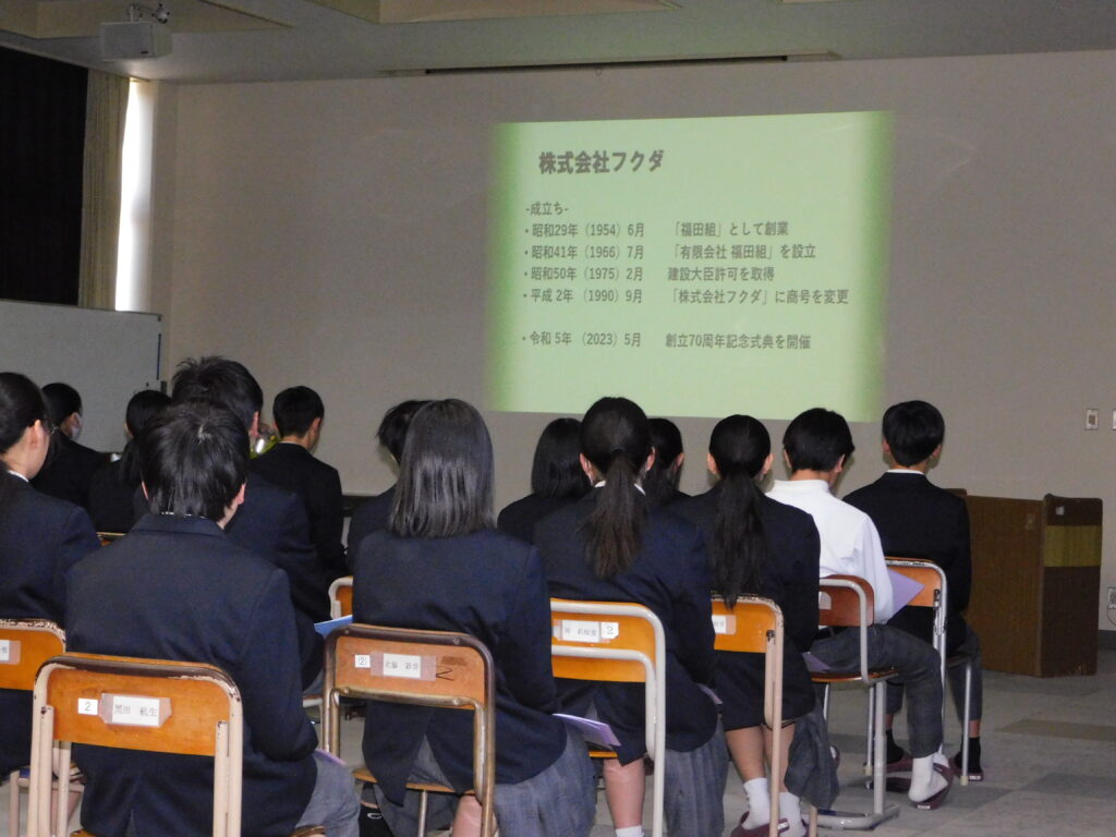 当日は、1年生約80名の生徒の皆さんにご参加いただき、建設業の役割や仕事の魅力について紹介するとともに、実際の現場で行われている業務内容ややりがいについて、具体的な事例を交えながらお話ししました。生徒の皆さんは真剣な様子で耳を傾けており、建築の仕事への理解を深めていただく機会となりました。