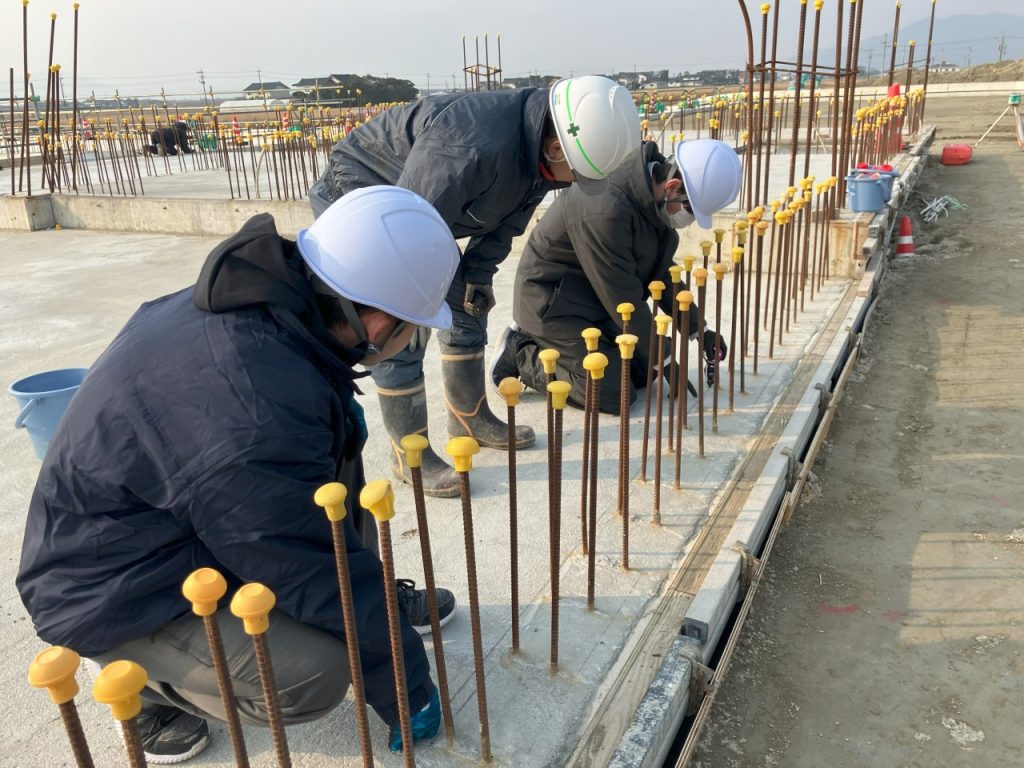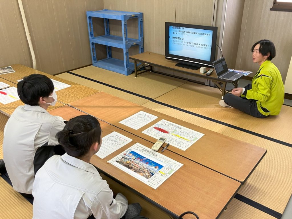令和7年1月27日から31日の5日間、インターンシップを実施いたしました。今回は、県外の大学から1名、県内の短期大学から2名、計3名の学生さんにご参加いただきました。インターンシップでは、本社にて会社概要の説明を行い、その後、若手社員との座談会を実施しました。さらに、弊社の若手社員が業務内容について説明し、施工中の建築工事現場の見学を行いました。実習では、測量や墨出し、軽作業などを実際に体験していただき、建設業の仕事に対する理解を深めていただきました。