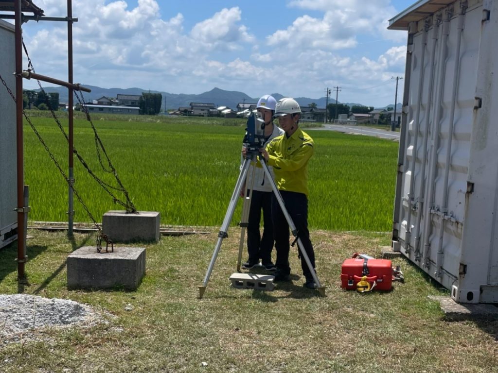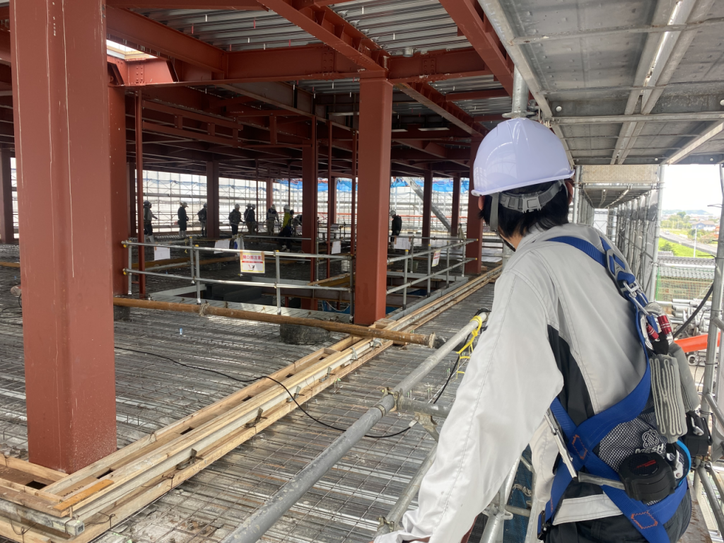 インターンシップ初日には、まず本社にて会社概要の説明やOB社員との座談会が行われ、その後、若手社員が現場での仕事内容について詳しく説明しました。説明の後には、実際に施工中の建築工事現場での測量や写真撮影、軽作業などを体験していただきました。