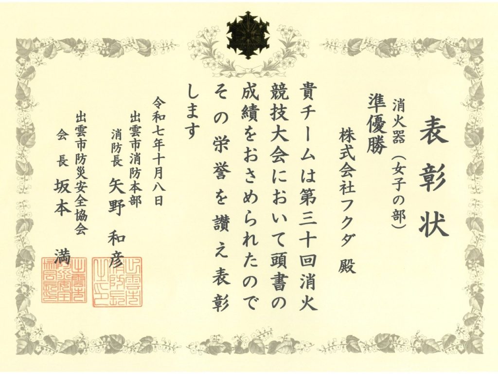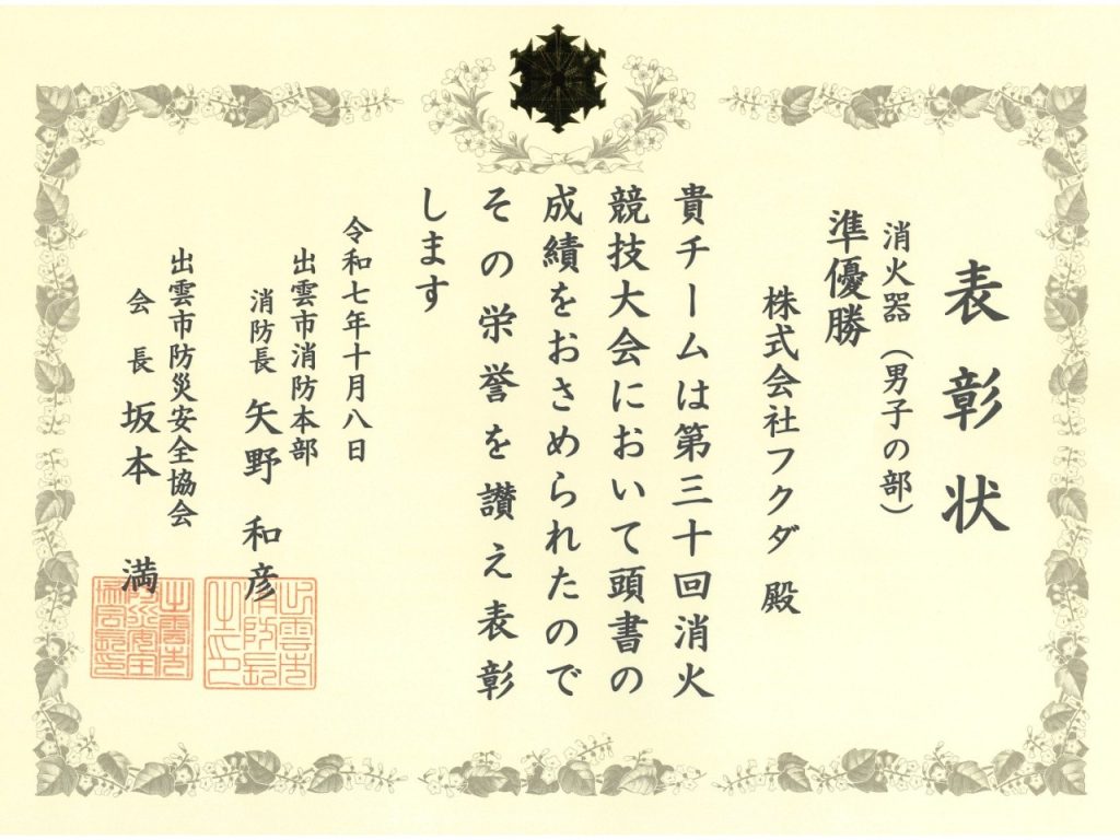 令和7年10月8日、出雲市消防本部にて「第30回消火競技大会」が開催され、去年に引き続き当社から4名の職員が参加しました。