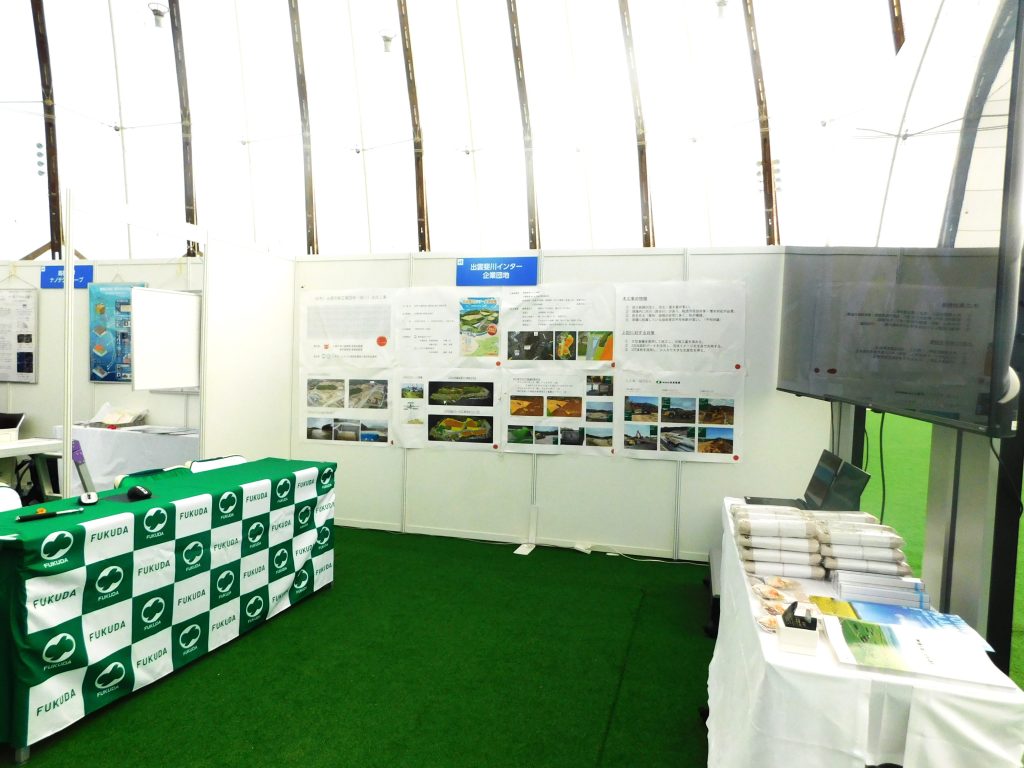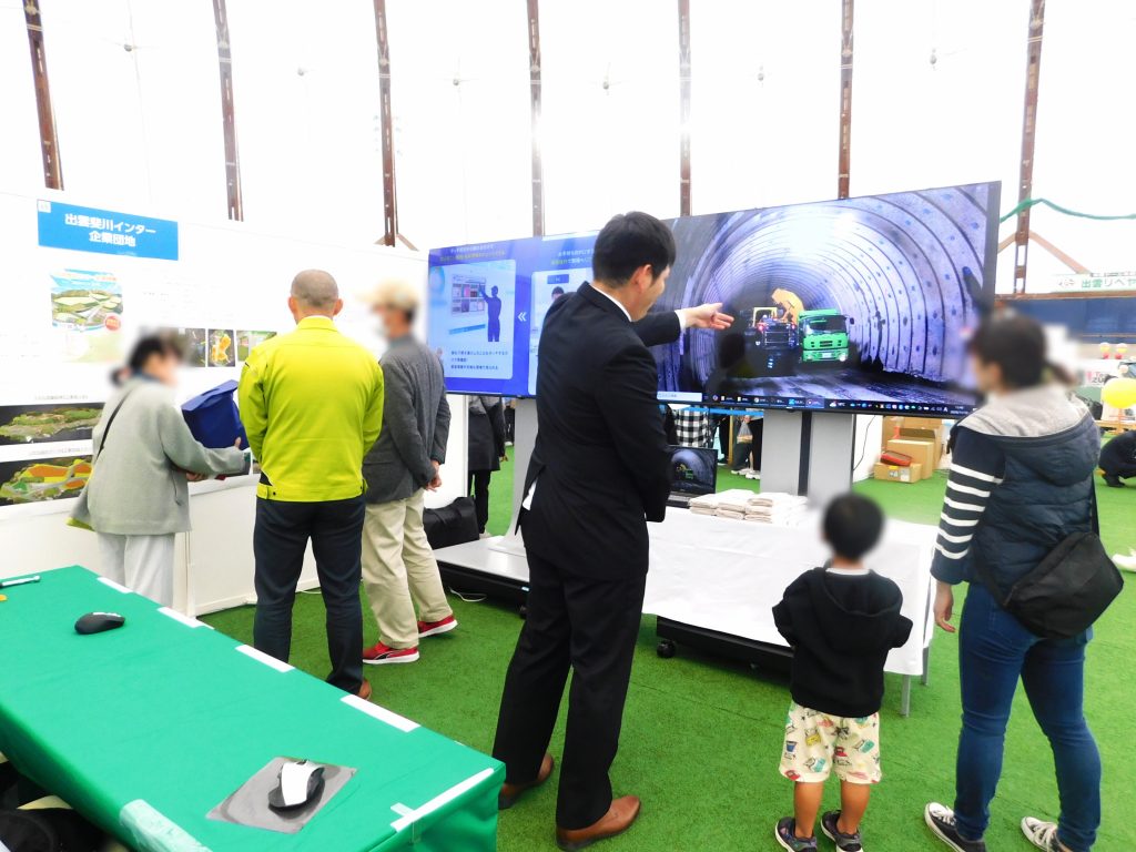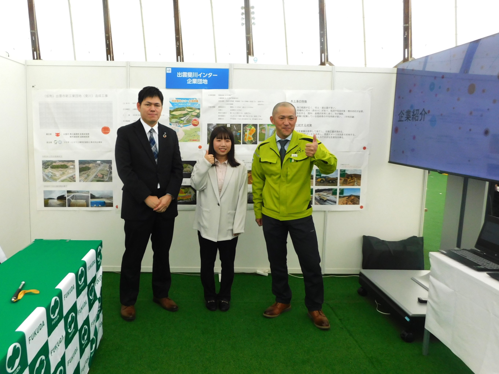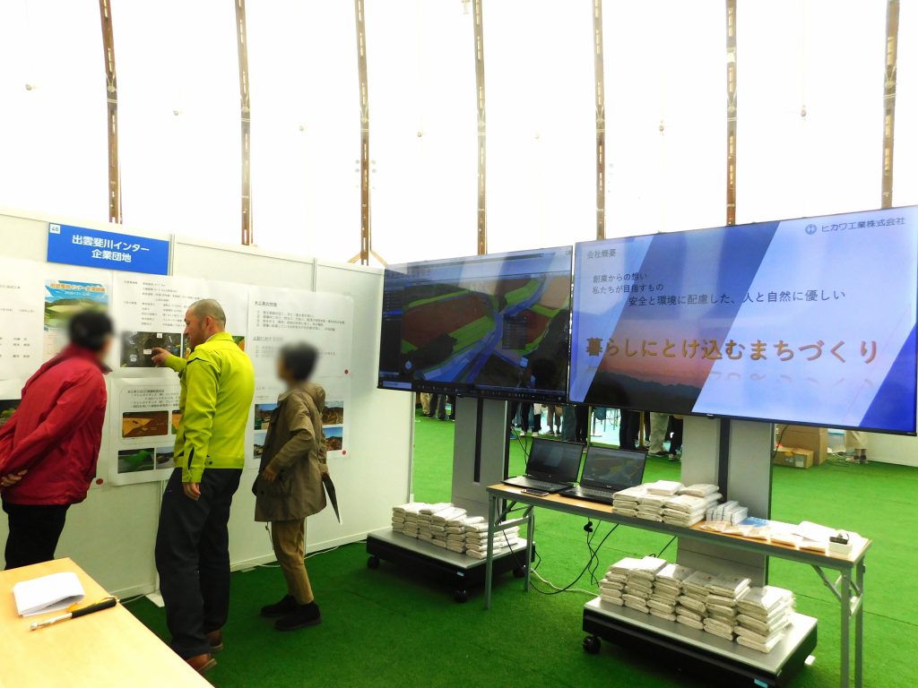 弊社は企画展示「出雲斐川インター企業団地」として出展し、現在ヒカワ工業株式会社とJV(ジョイントベンチャー)で進めている工事で活用している、情報通信を駆使した最新の土木施工技術を紹介いたしました。イベント期間中には、100組を超える皆様にご来場いただき、企業団地工事に対するご理解を深めていただくとともに、普段あまり知る機会がない地元建設業の活躍を知っていただくことができたかと思います。