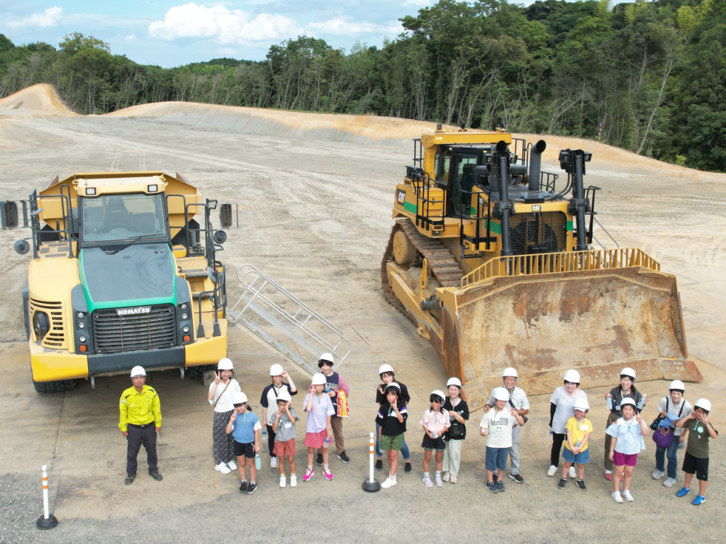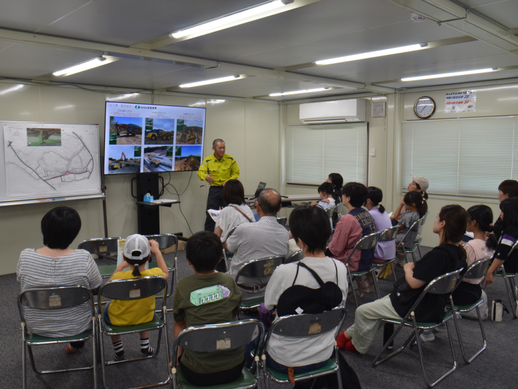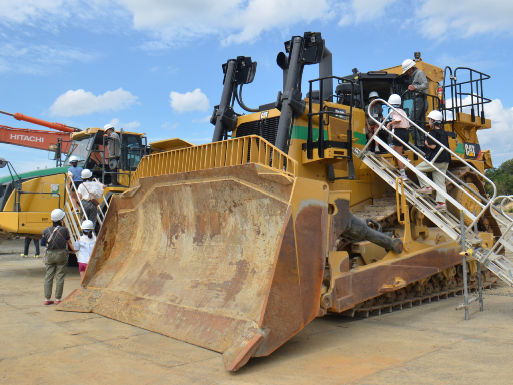 当日は天候にも恵まれ、まずは工事の概要をご説明した後、実際に工事が進行中の現場をご覧いただきました。見学中には、ブルドーザーやパワーショベル、ダンプなどの重機を間近で見ていただき、実際に運転席に座っていただく体験も行いました。