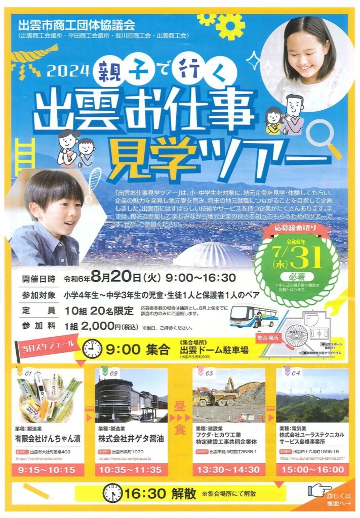 令和6年8月20(火)に出雲市商工団体協議会様が主催で「2024親子で行く 出雲お仕事見学ツアー」が開催されます。このツアーは小・中学生を対象に、地元企業を見学・体験してもらい企業の魅力を発見し地元愛を育み、将来の地元就職につながることを目指して企画されたものですが、弊社も「フクダ・ヒカワ工業特定建設工事共同企業体」として地元企業の魅力発信のためご協力させていただきます。