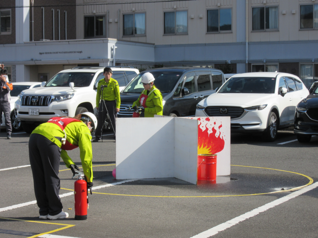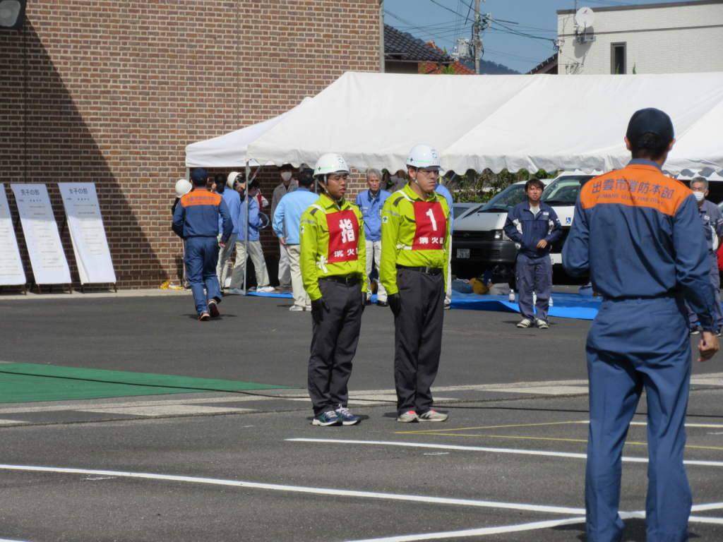 この大会は出雲市消防本部様の主催により消火器の取扱いと操作技術を競うもので、火災発生時に迅速で的確な対応ができる体制の確立、効果的な初期消火活動、被害軽減を図るための技術習得を目的に、二人一組で火災発生時の通報状況や水消火器による放射を行い得点を競います。
