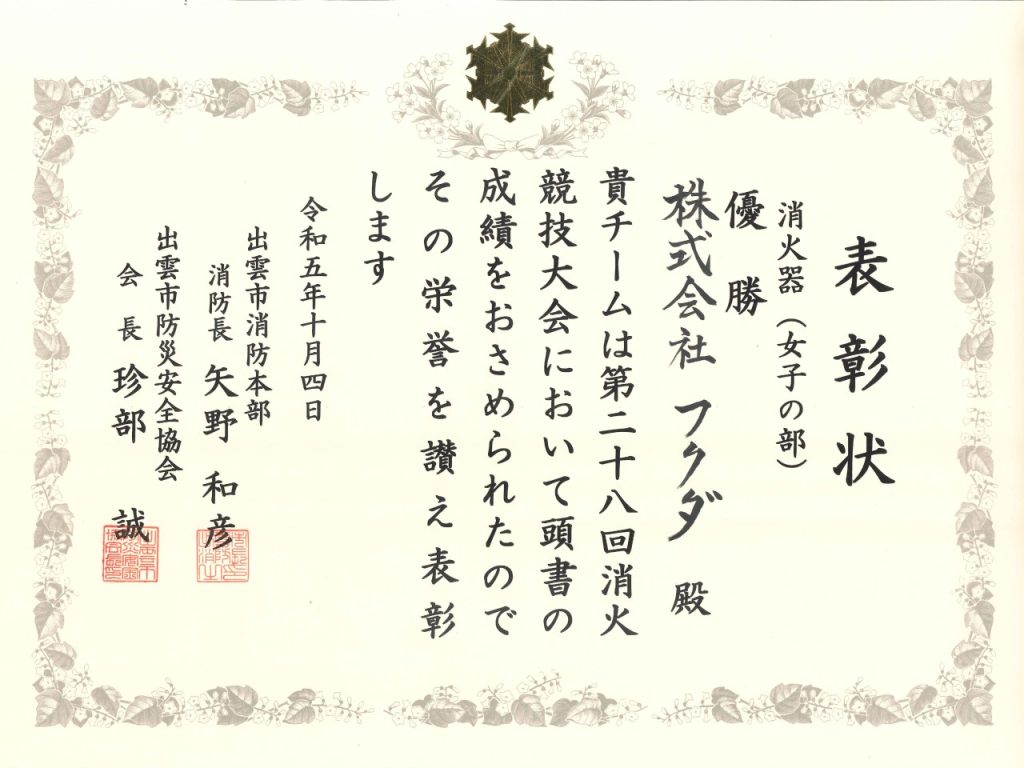 令和5年10月4日(水)、出雲市消防署にて「第28回消火競技大会」が開催され、当社から4名の職員が参加しました。