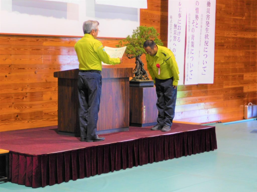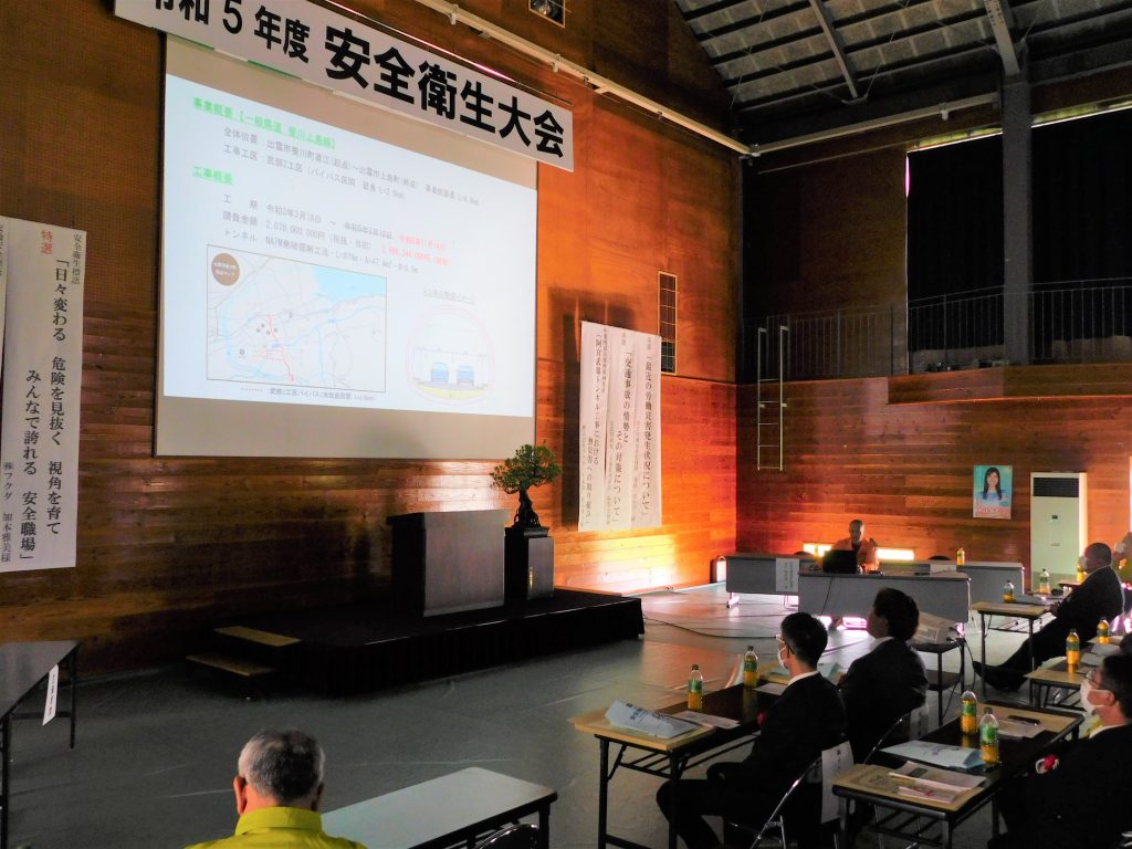本年は4年振りにコロナ禍の以前の規模として開催いたしました。多くの協力企業の皆様やグループ企業の皆様にもご参加いただき、総勢250名程で行いました。安全優良表彰のあとに、ご来賓としてお越しいただいた出雲労働基準監督署署長 川角洋二様に「最近の労働災害発生状況と今後の取り組みについて」という題目でご講演いただきました。
